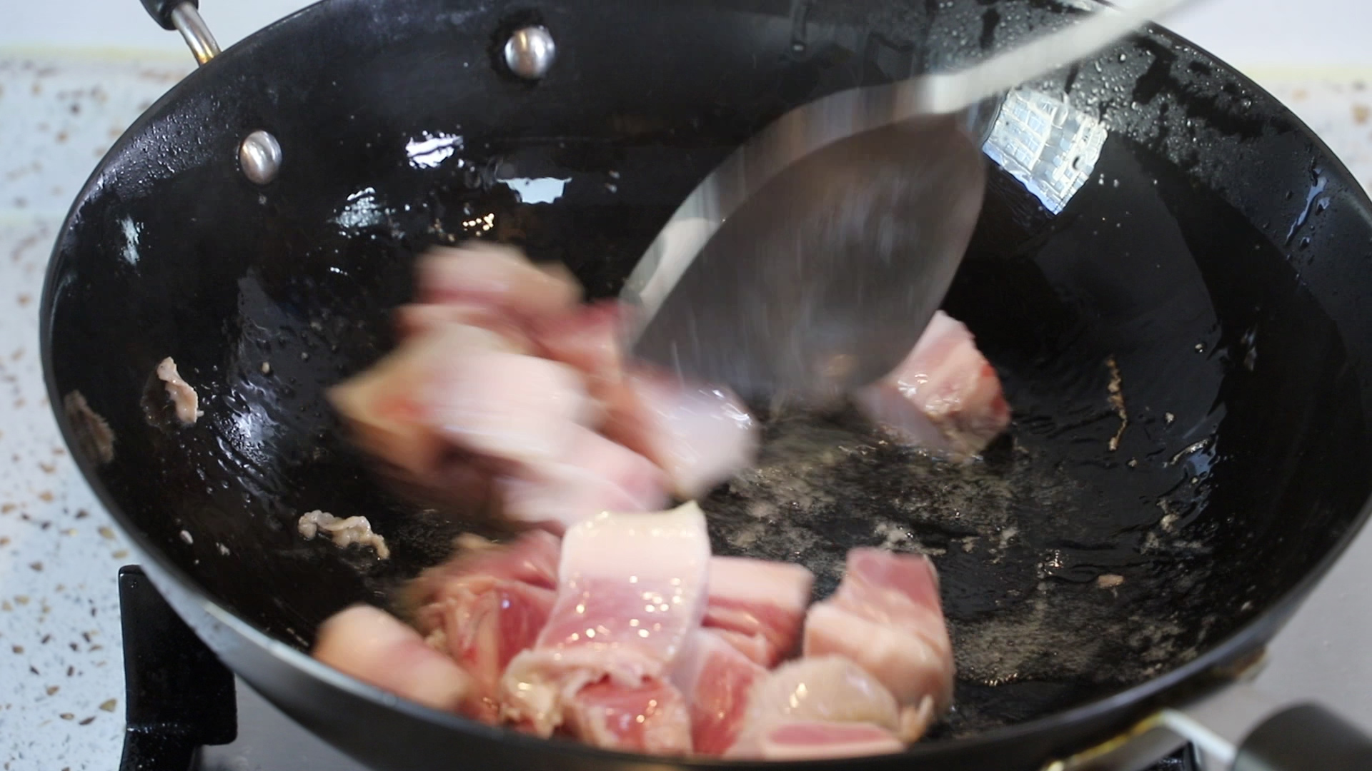 步骤5、下入五花肉,翻炒上色