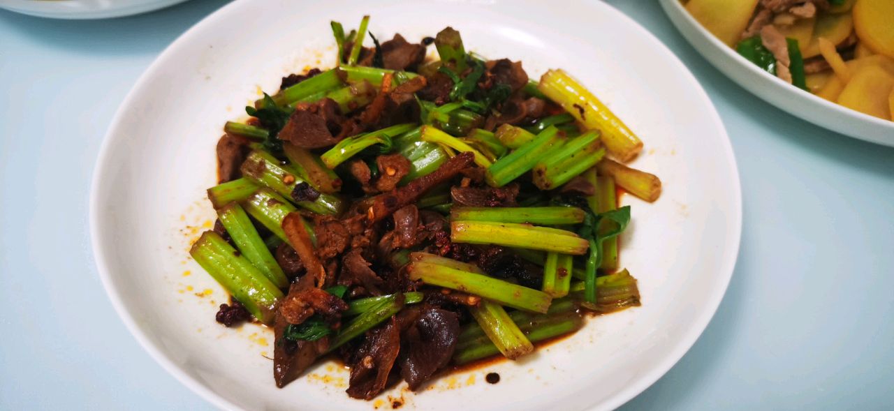 步骤4、入芹菜,翻炒,加盐,少许生抽。