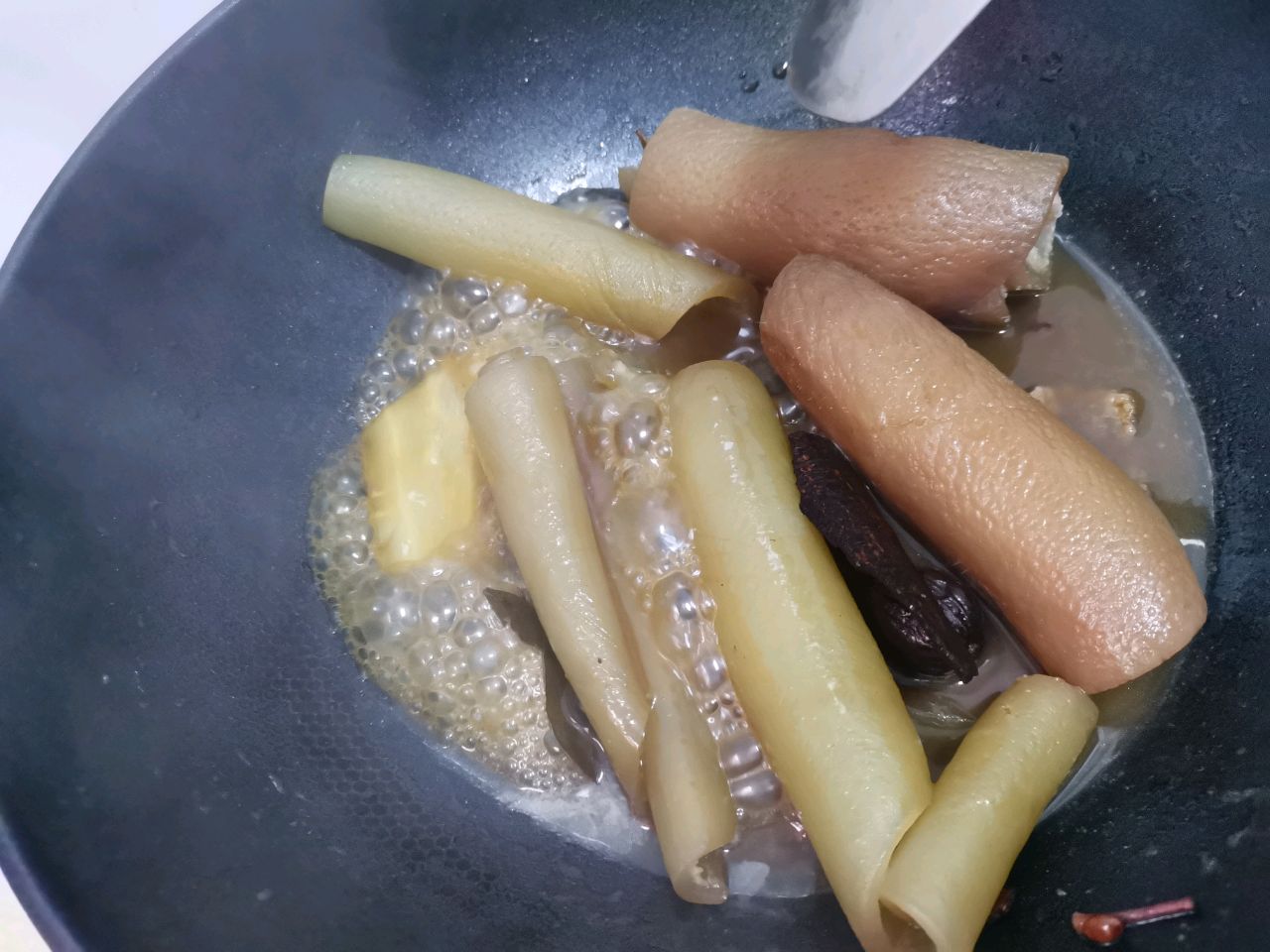 步骤2、煮好的猪皮过凉水,用刀把油刮掉,刮好加水放入卤料包加酱油跟一勺子盐,煮