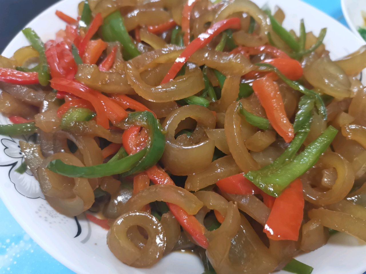 主料:猪肉皮,、青红辣椒各两条