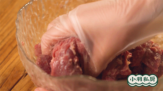 步骤2、牛里脊切成薄片,加入1大勺淀粉,3大勺蒜水,搅拌到上劲。