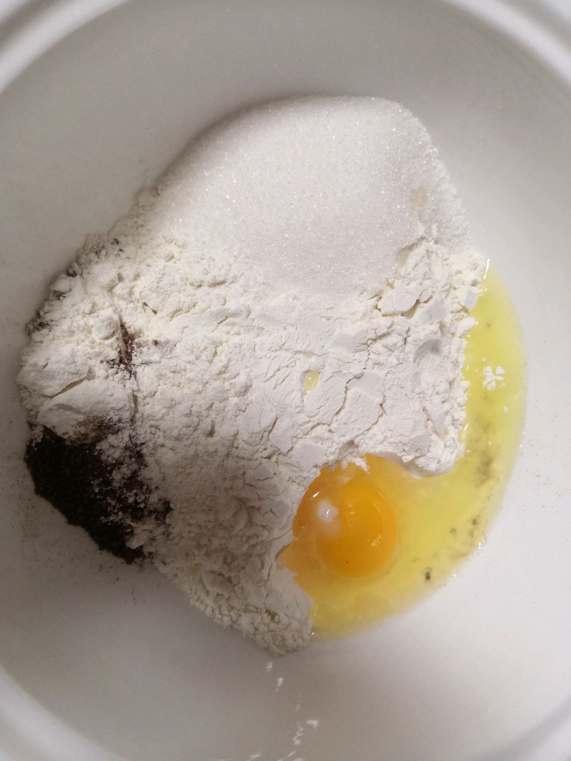 步骤1、将面粉、鸡蛋、巧克力粉、糖搅拌均匀,慢慢倒入牛奶,活成面团,放面包机里,放酵母进行第一次揉面。