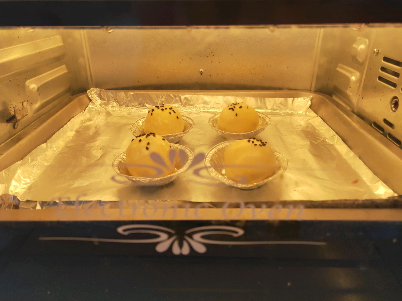 步骤1、蛋挞皮解冻五分钟,把未解冻的汤圆包在里面,用魔力小手揉一揉,表面均匀涂抹一层蛋液,撒上黑芝麻。