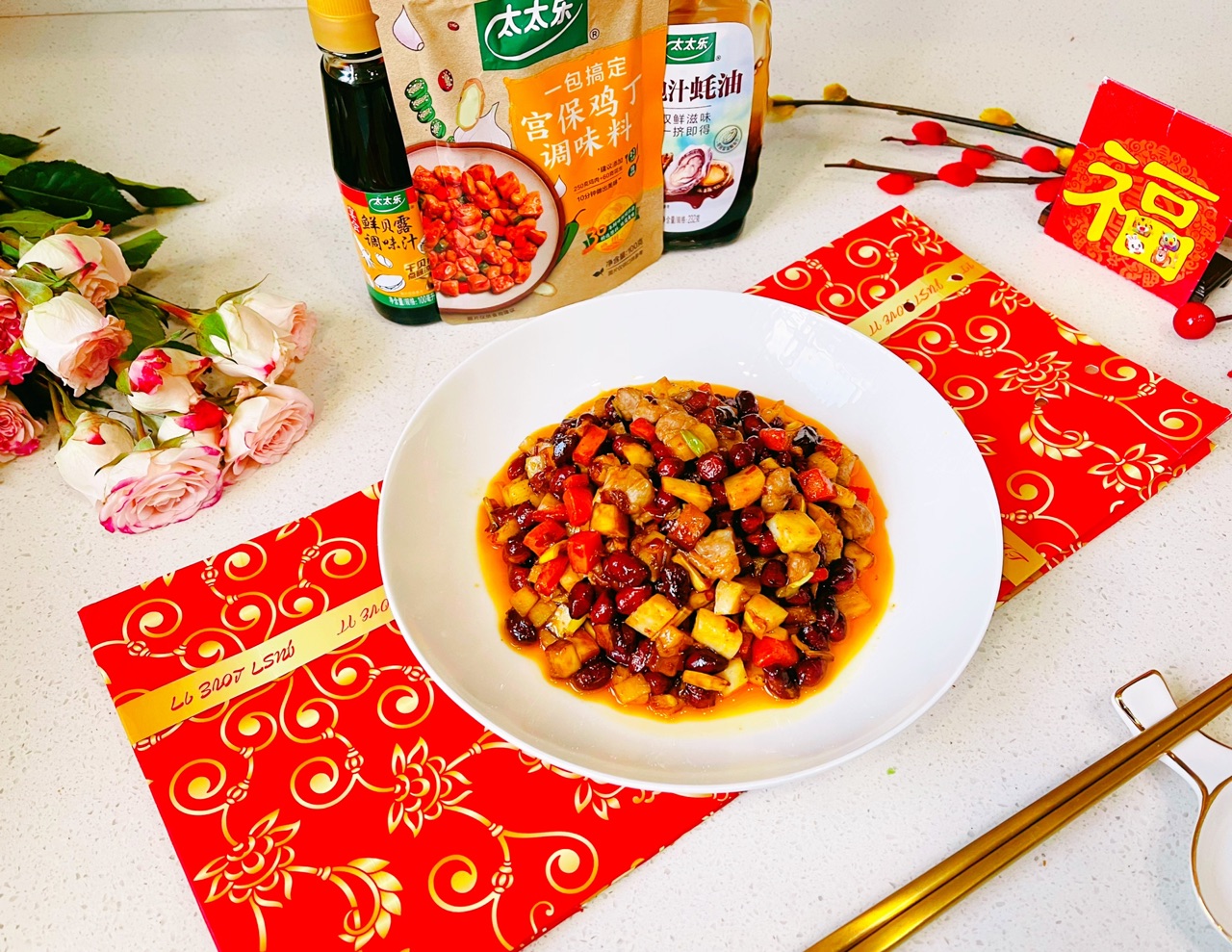 辅料:豆干丁60克、笋丁80克、胡萝卜丁1根、太太乐鲍汁蚝油半勺、宫保鸡丁调味料3分之一、食用油三勺、葱花适量、糖适量