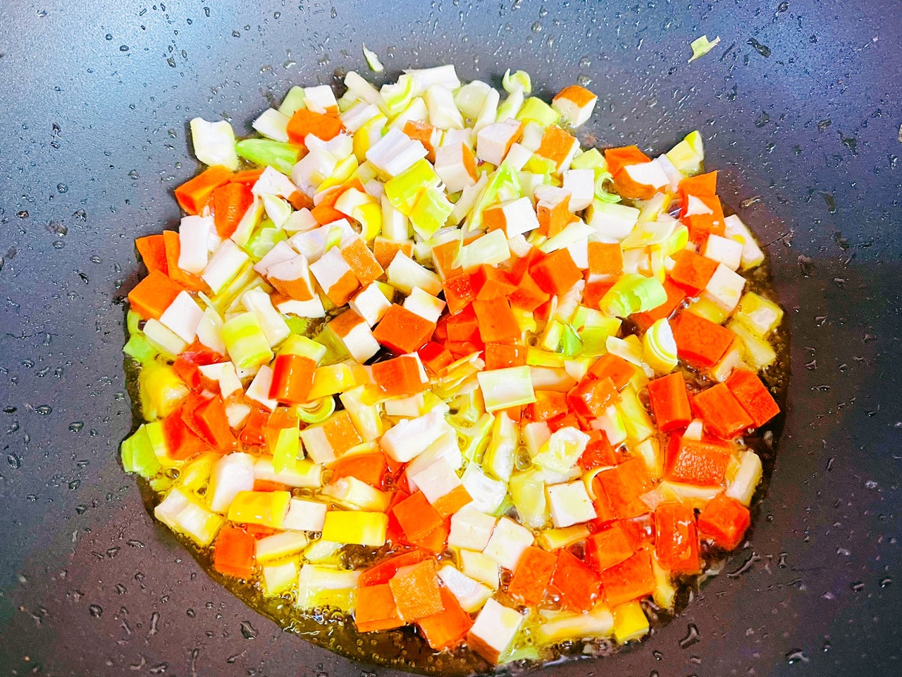 步骤4、余油下入胡罗卜,竹笋,豆干丁煸炒