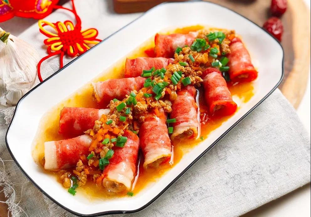 步骤15、将芡汁浇在蒸好的培根卷上,肉末淋在中间,再撒上适量葱花提个色,这道喜气满满的新年宴客菜就完成了;