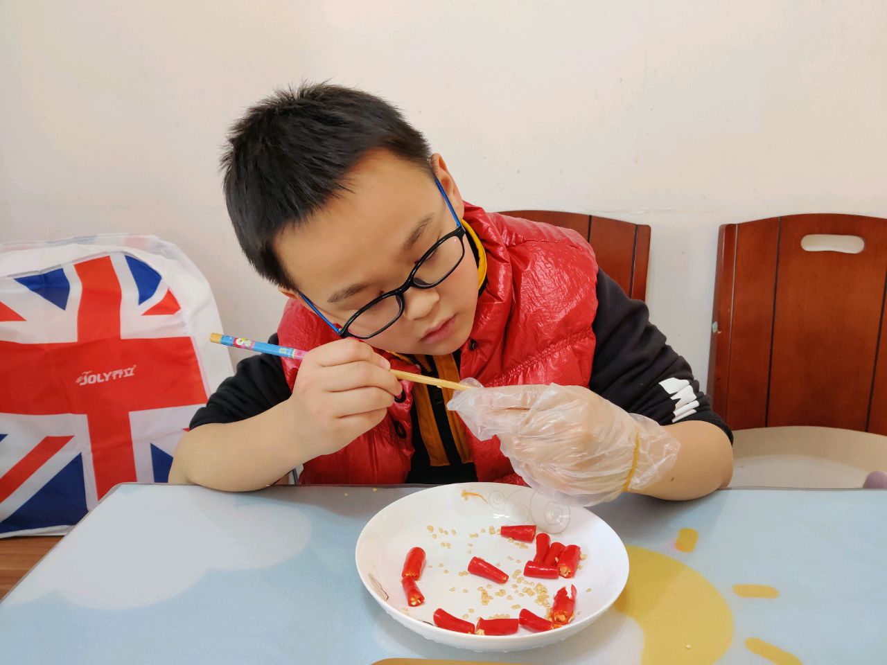 步骤4、摆盘。一个辣椒对半切开,一个做鞭炮头,一个做鞭炮尾巴,为了好看,尾巴可以做两个。最后两侧撒上之前剩下的辣椒做装饰。