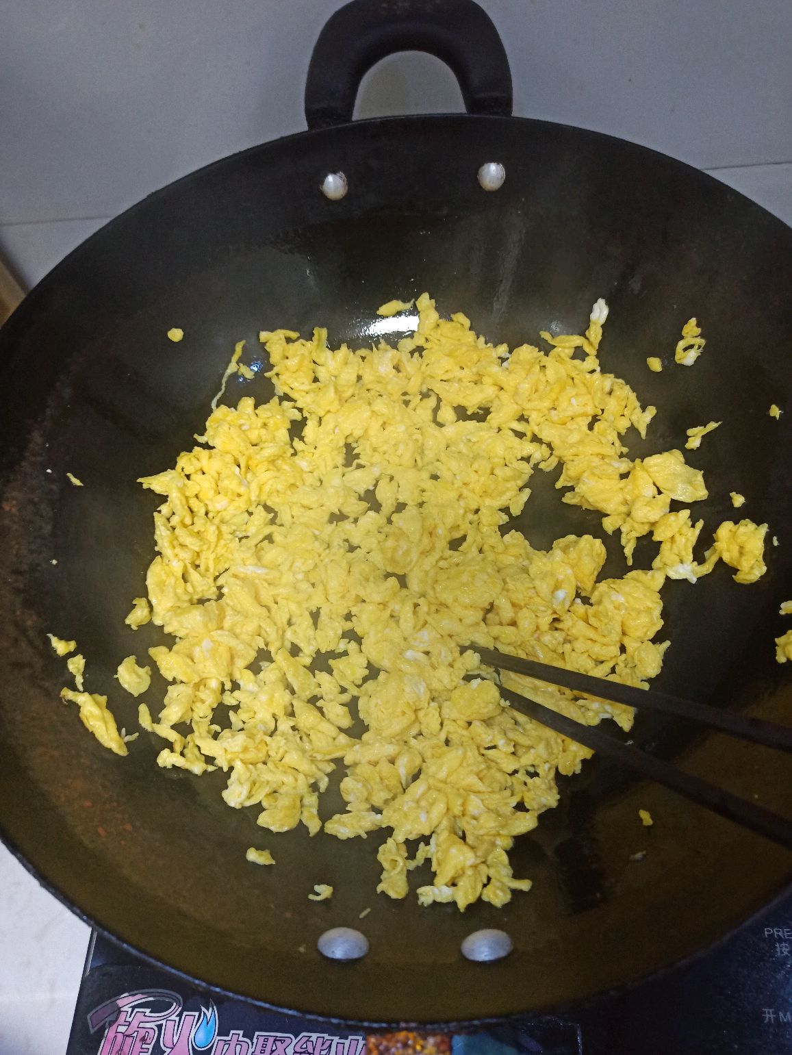 步骤1、鸡蛋液凉油下锅,用筷子快速搅拌