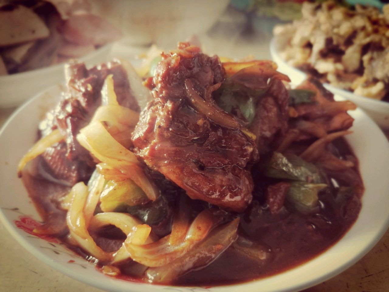步骤8、时间到汤汁收差不多放入洋葱青椒翻炒2分钟