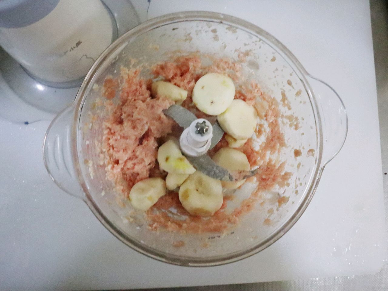 步骤3、搅打成比较细腻的肉糜,加去皮的荸荠打碎颗粒