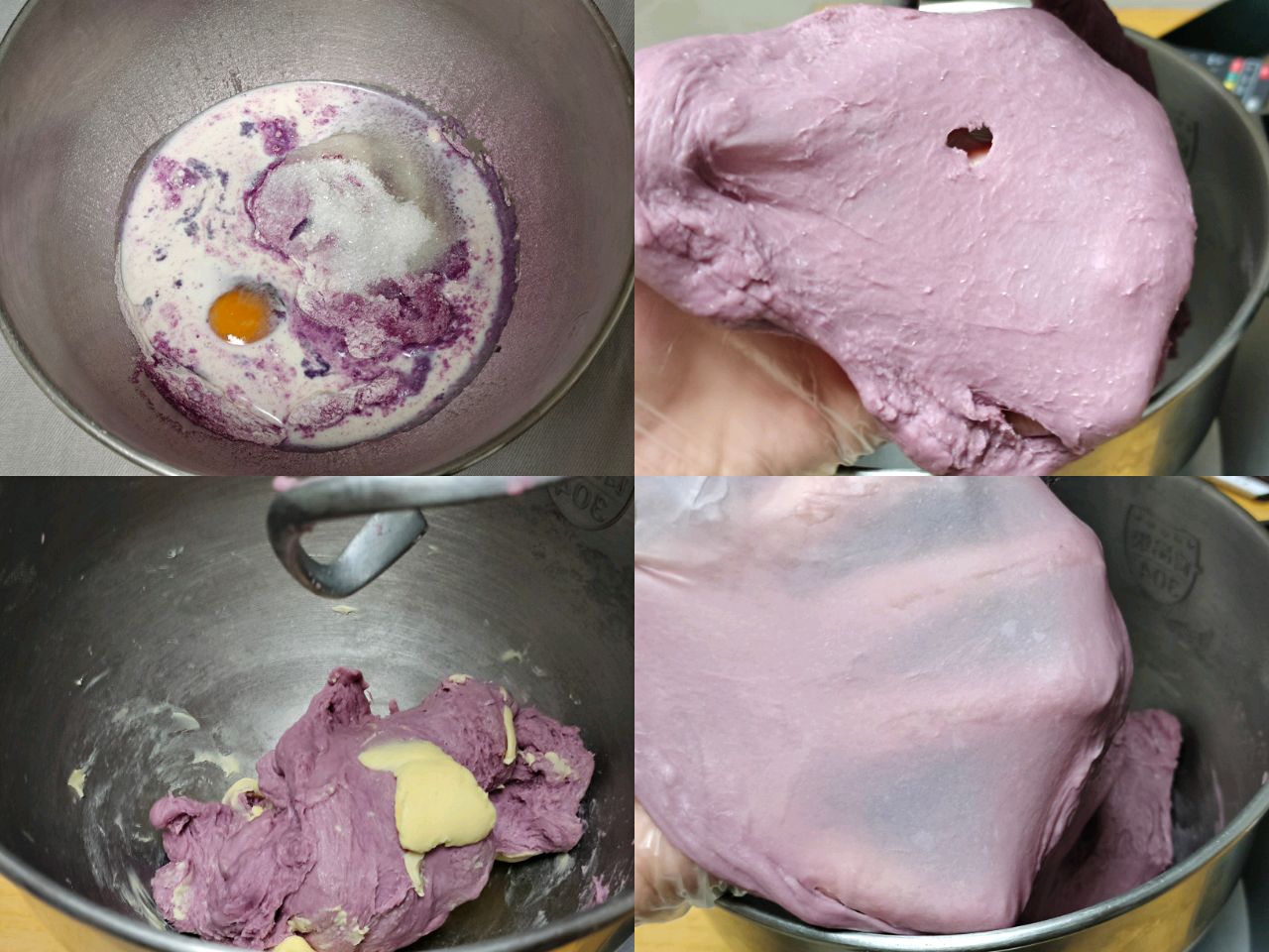 步骤1、首先制作芋头紫薯泥。芋头是荔浦芋头,粉糯,又香。切片蒸熟,趁热加入融化的黄油,奶油,白糖,用料理机打成泥。