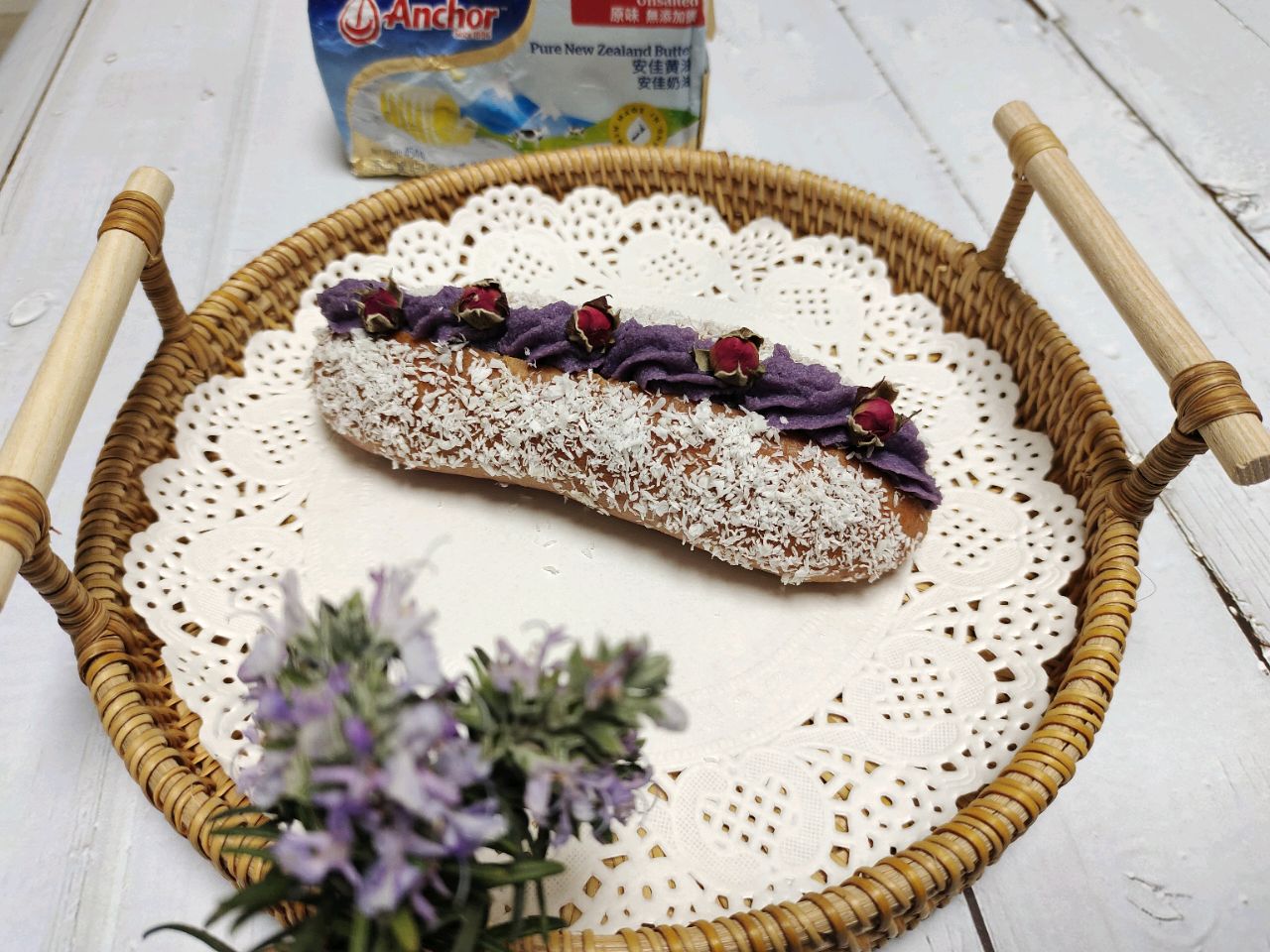 步骤5、紫薯芋泥装进裱花袋,面包冷却后中间开口至底部,不要切断,表面刷上融化的黄油,在椰蓉上轻压,中间挤入紫薯芋泥。