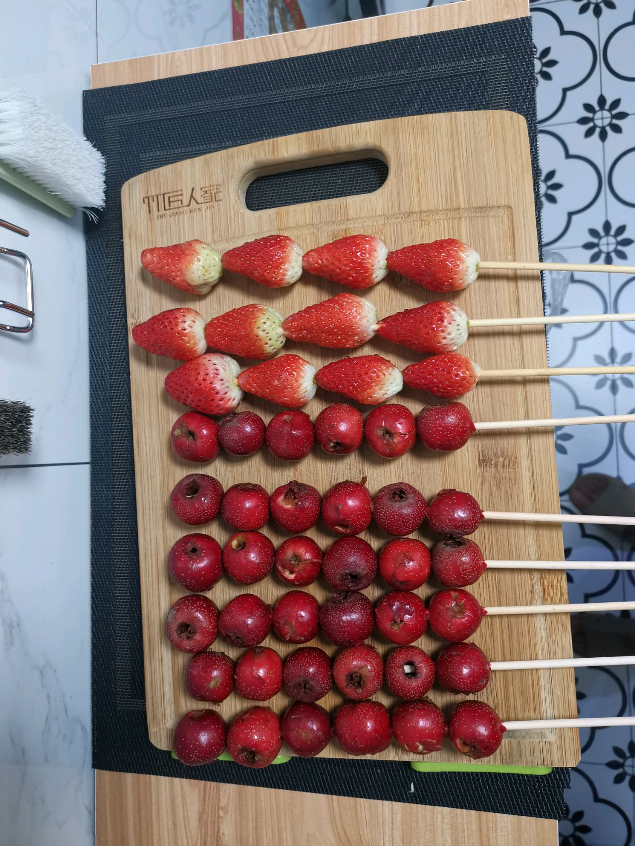 步骤6、烤盘提前抹油,防止粘粘,串好的糖葫芦下锅蘸糖,撒上芝麻酸酸甜甜的冰糖葫芦就做好了