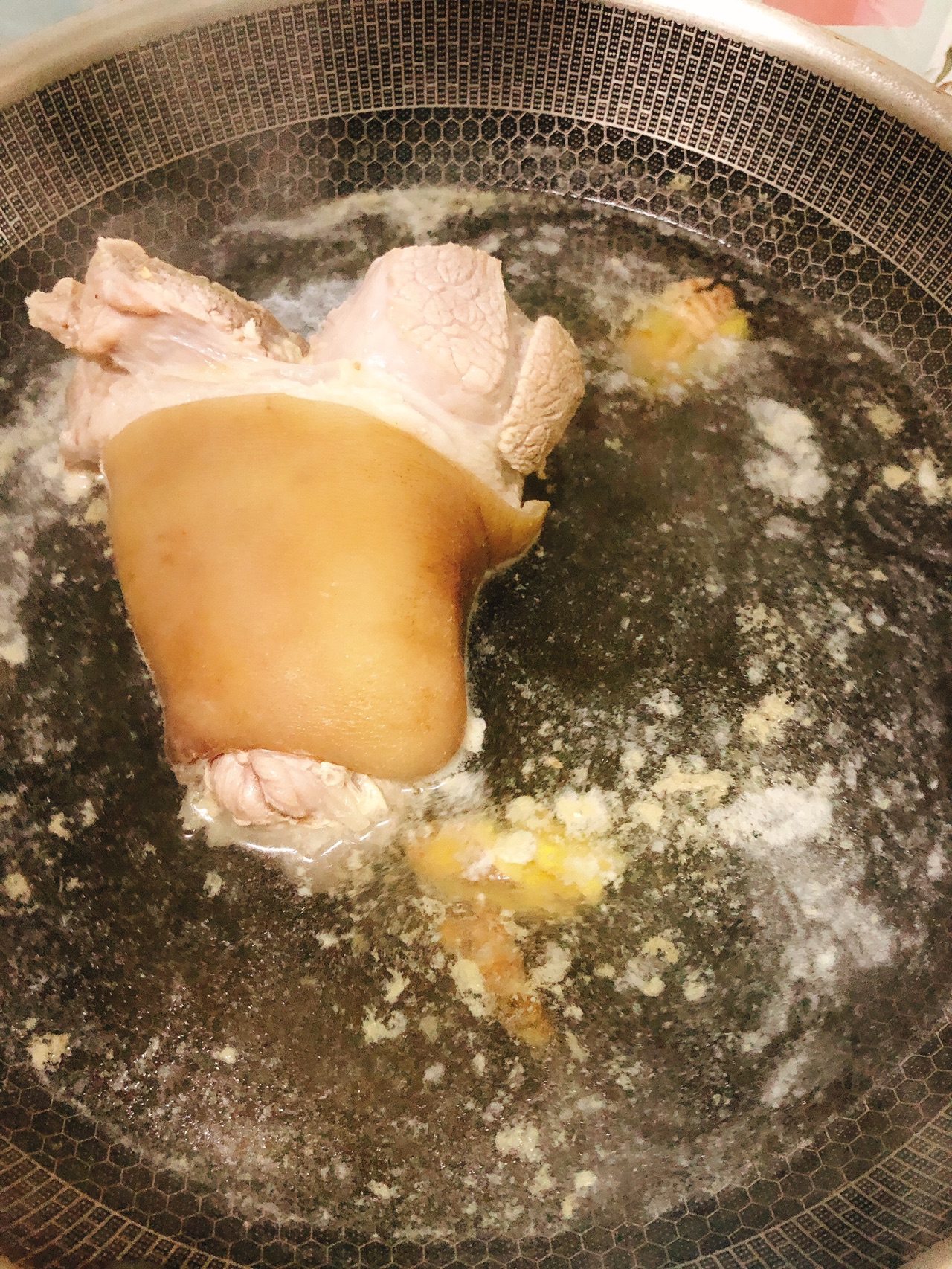 步骤1、肘子皮在火上烧一下,去除毛,也可以让肉铺老板用火枪操作一下,用清洁球擦去烧黑的地方,凉水下锅,放姜和料酒焯水