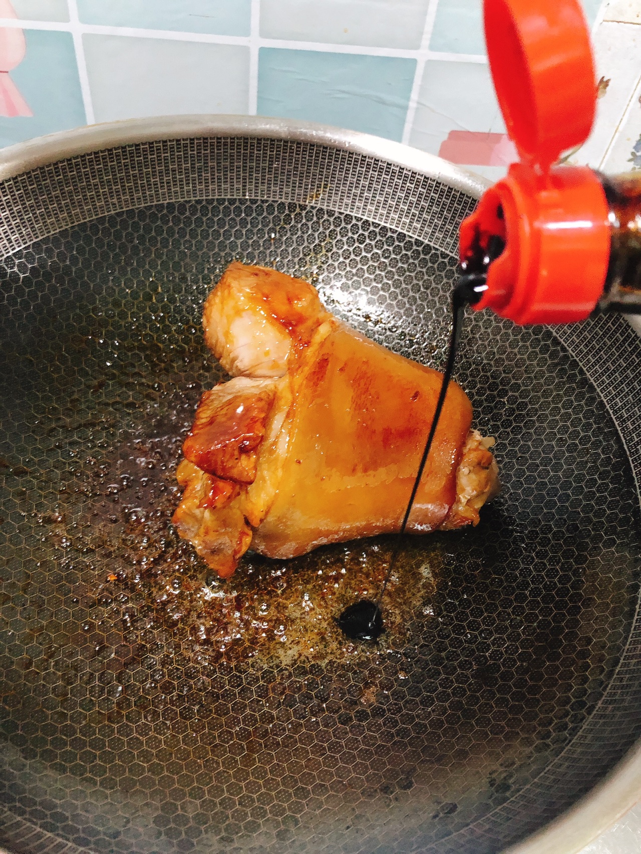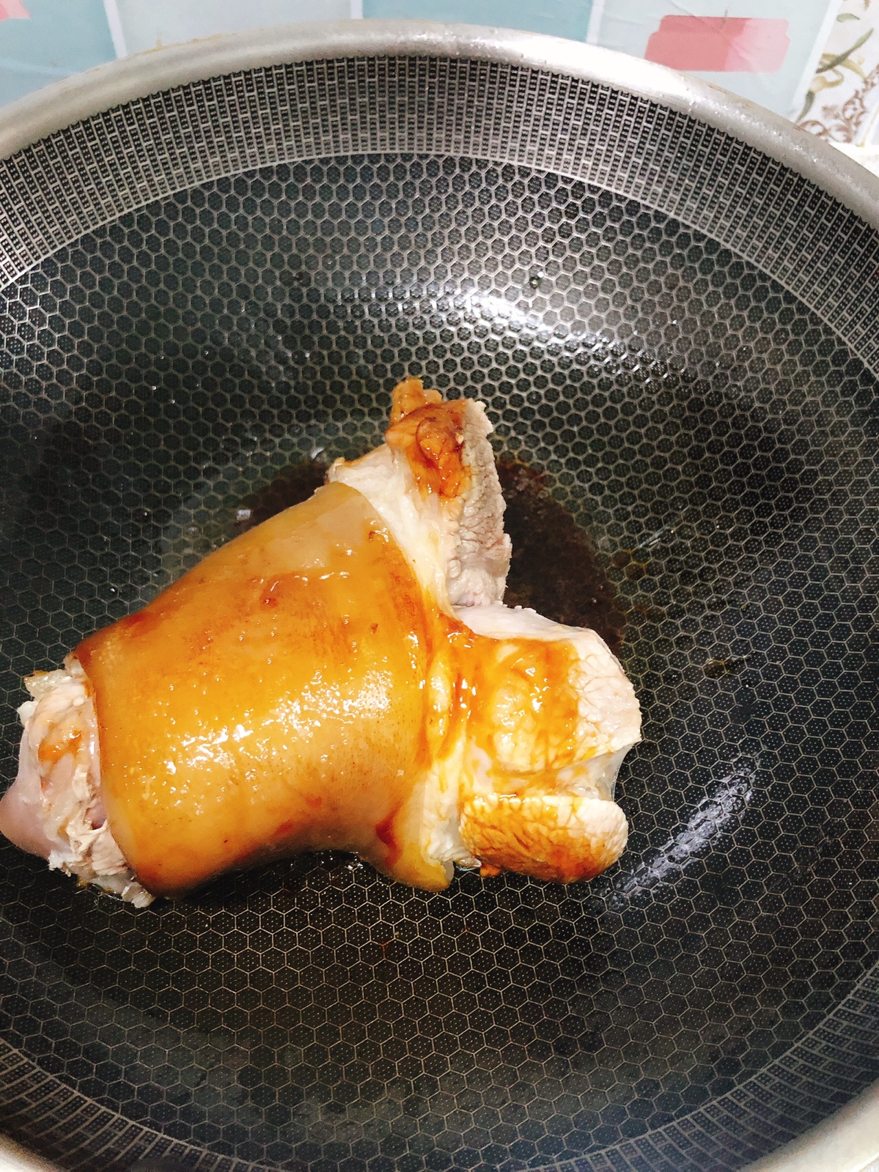 步骤4、把擦干的肘子放进去,四周都沾上糖色