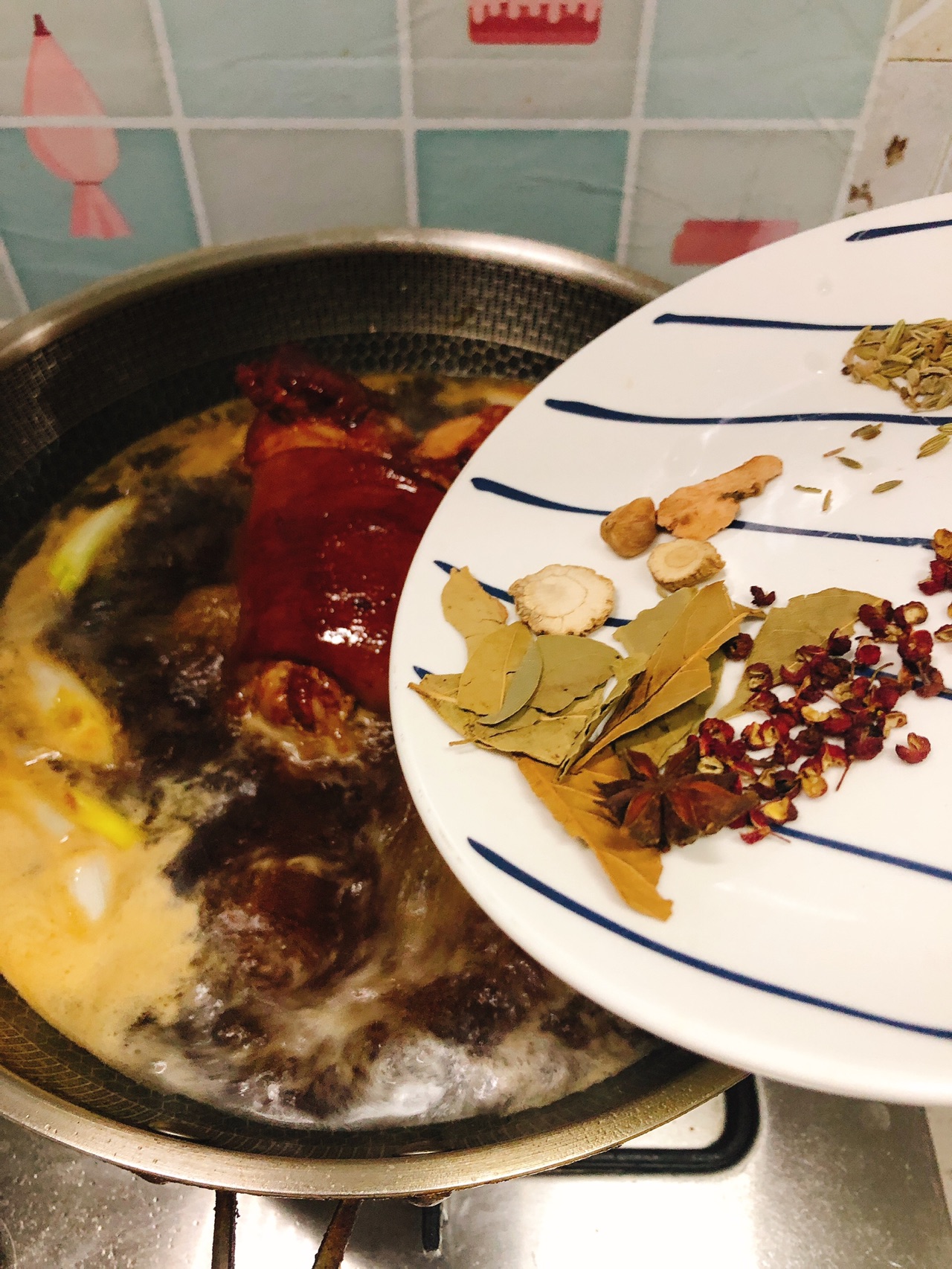 辅料:八角1个、香叶4片、桂皮1块、花椒一小勺、小茴香两小勺、白芷一片、白蔻一粒、良姜一小块、生抽3勺、老抽1勺、冰糖20克、洋葱半个、黄豆酱两勺、淀粉两勺