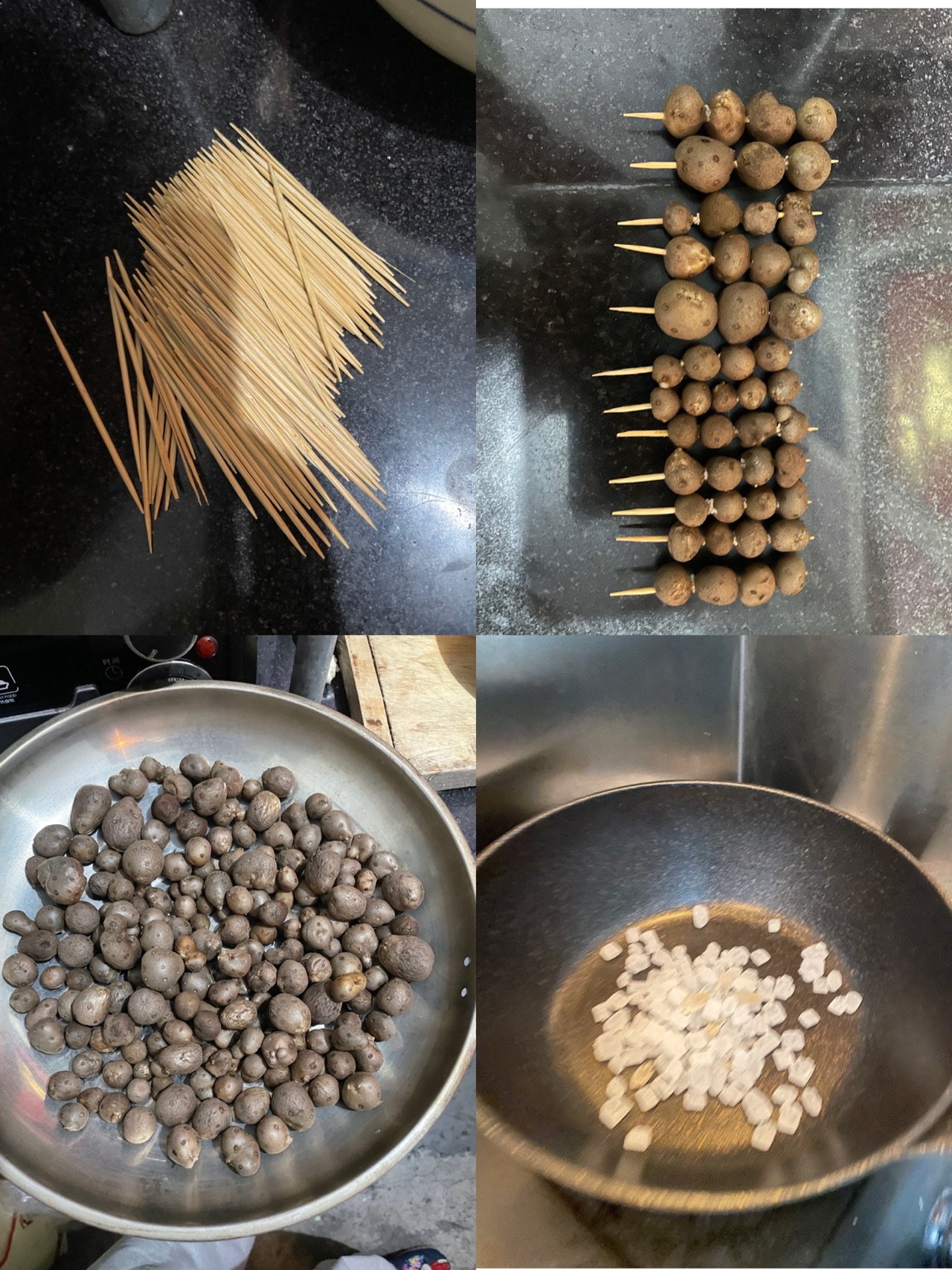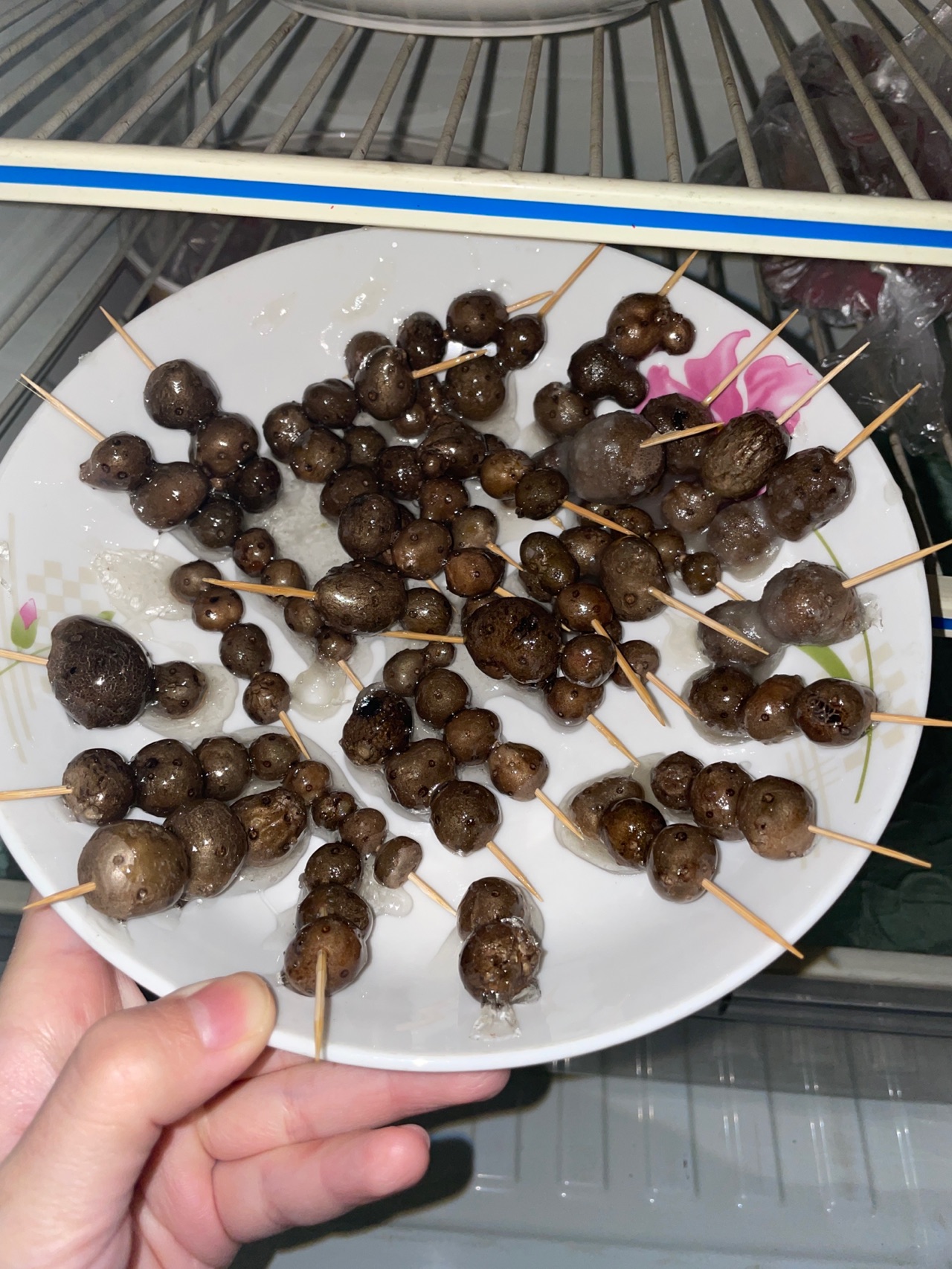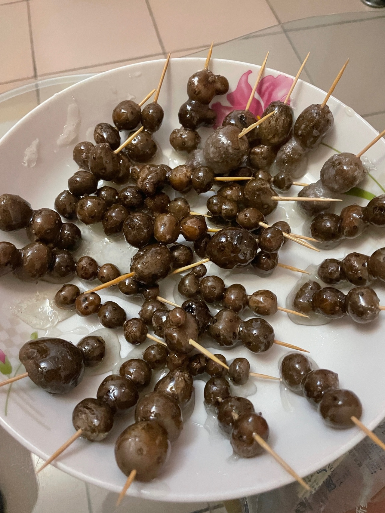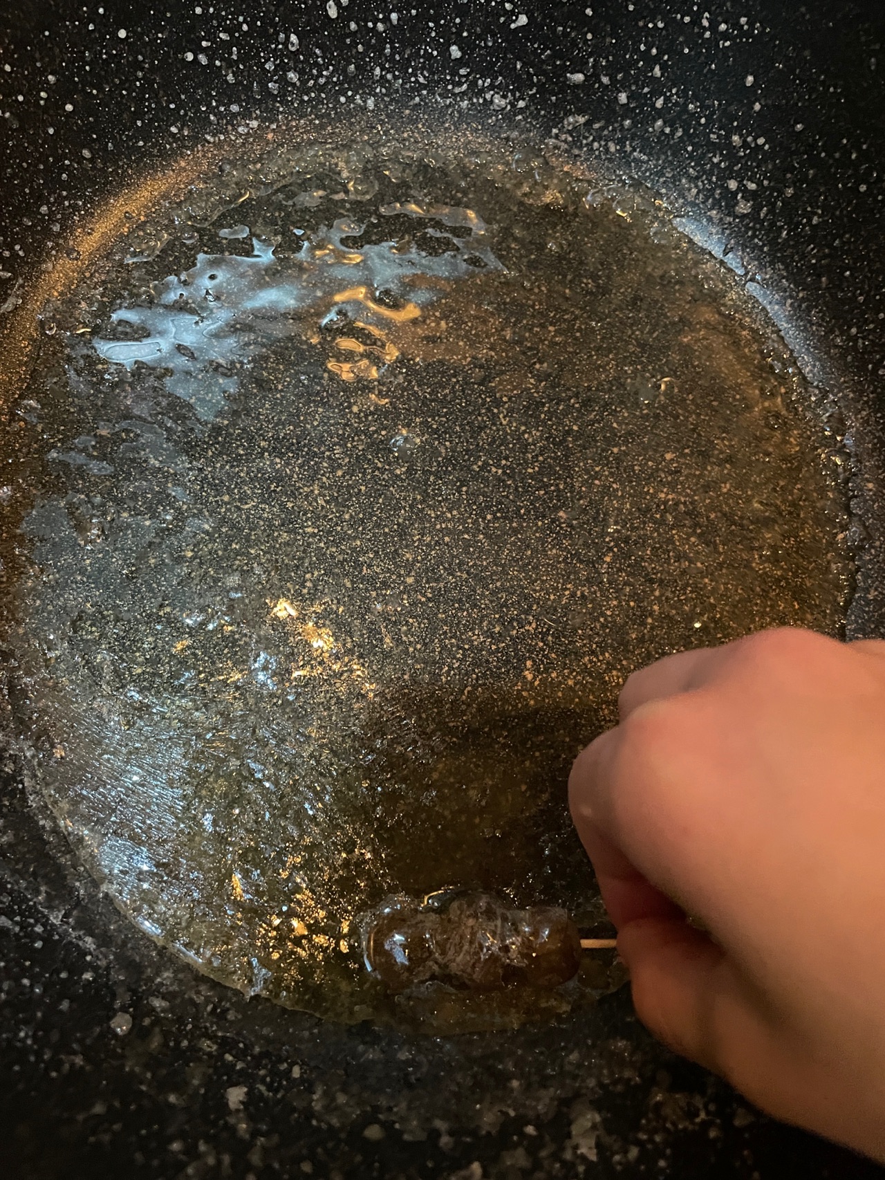 步骤3、把串好的山药豆放到糖稀里反转均匀