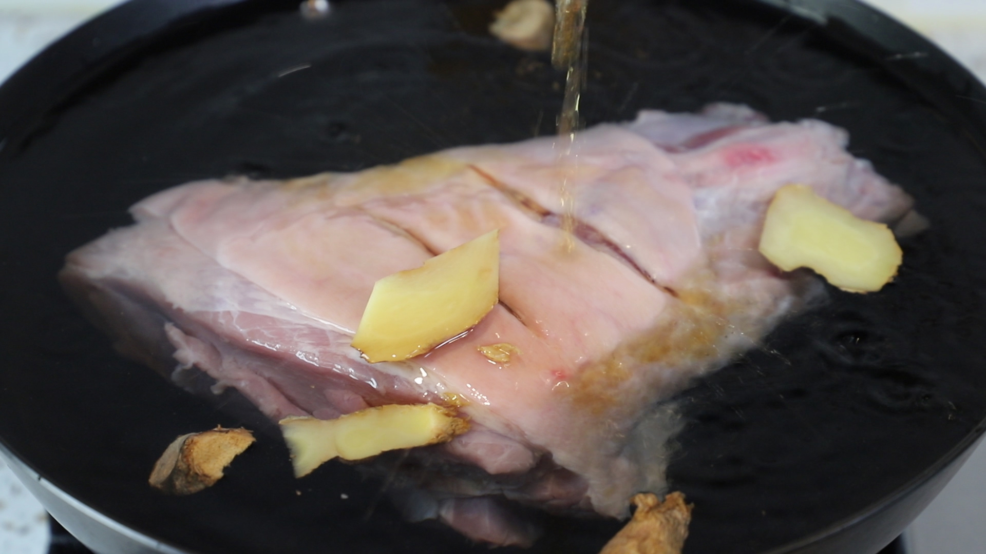 步骤2、冷水下锅,放入姜片料酒焯一下水,开锅后撇干净浮沫捞出