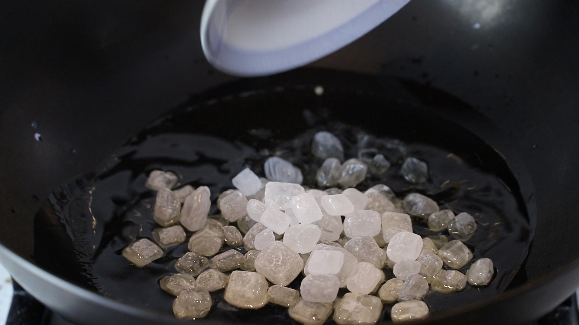 步骤4、熬至橘红色,微微冒泡,下入猪肘子