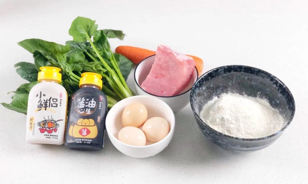 辅料:食用碱1g、清水150g、胡萝卜适量、鸡蛋3个、猪肉1块、盐适量、淀粉1勺、甜面酱1勺、小鲜侣调味汁适量、酱油心生适量