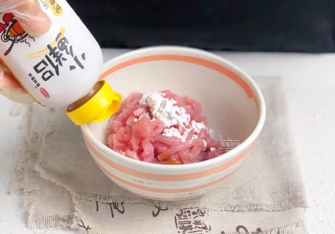 步骤13、猪肉切成细条,挤入小鲜侣调味汁、1勺淀粉、再挤入适量酱油心生,搅拌均匀腌制一会儿;