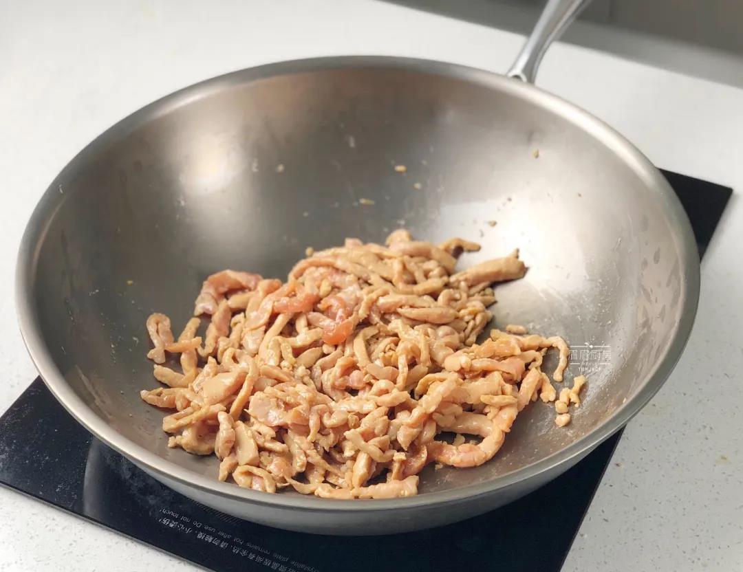步骤14、鹅妈妈钛晶锅中倒入肉丝翻炒至变色;