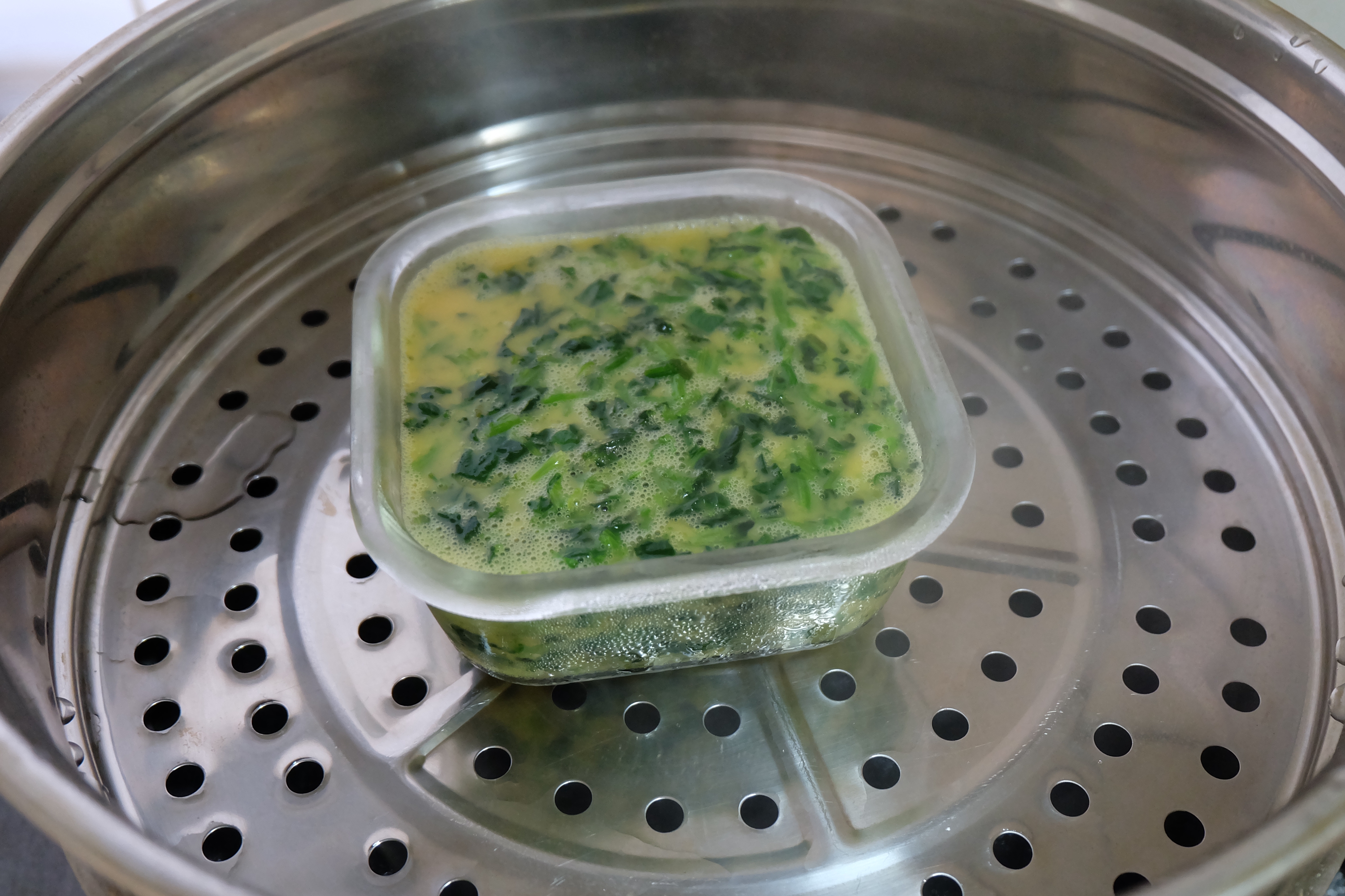 步骤7、蒸锅烧开水,放上蒸屉。取一个耐高温的容器,内壁抹油可以帮助防沾,把菠菜鸡蛋液倒进去;