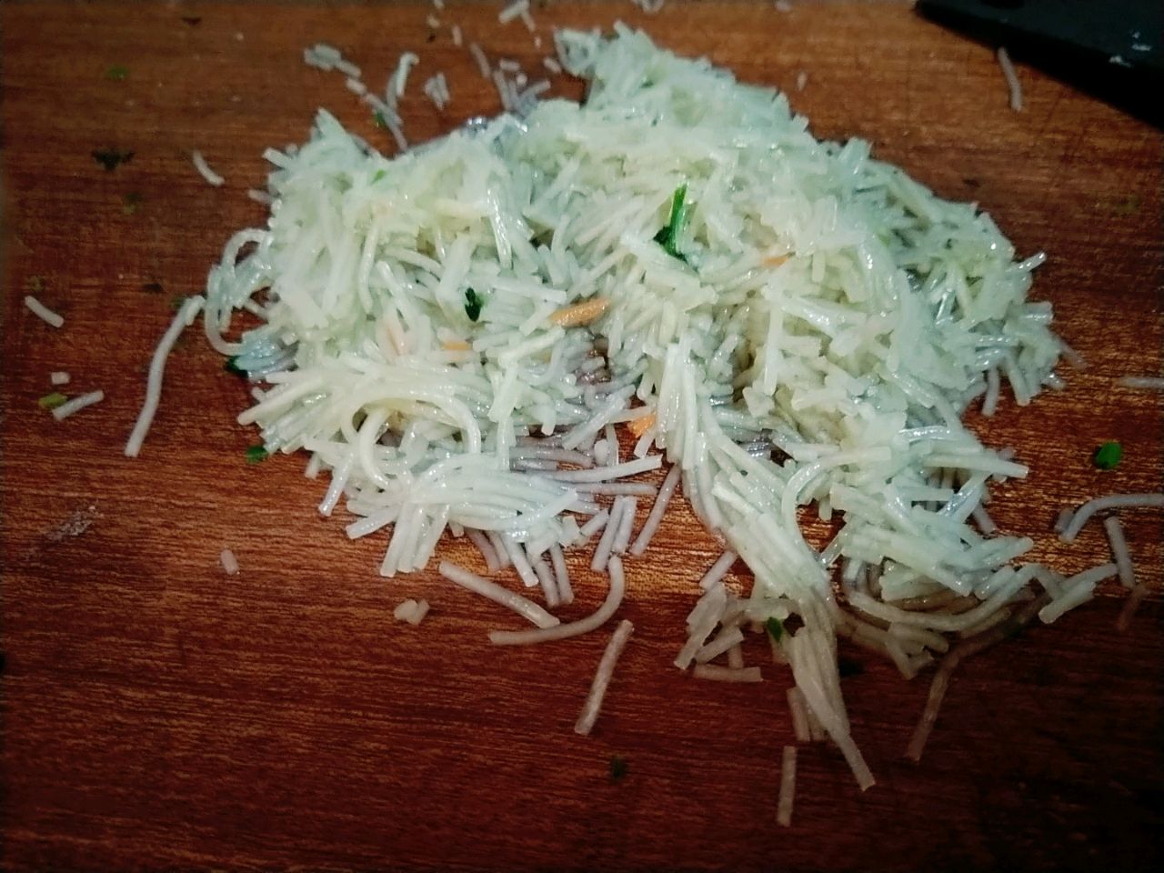 辅料:豆腐300克、粉条50克、葱末姜末适量、花生油适量、十三香1勺、食盐1勺