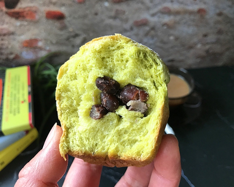 步骤14、香喷喷又好看的菠菜汁蜜豆软欧包就做好了