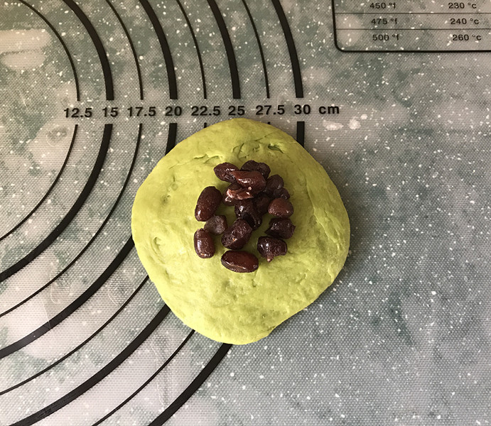 辅料:面包粉种50克、鸡蛋2个、食盐4克、酵母5克、安佳黄油20克、安佳奶粉30克、白糖40克、菠菜汁170克、高筋面粉450克、蜜豆适量、高筋面粉少许