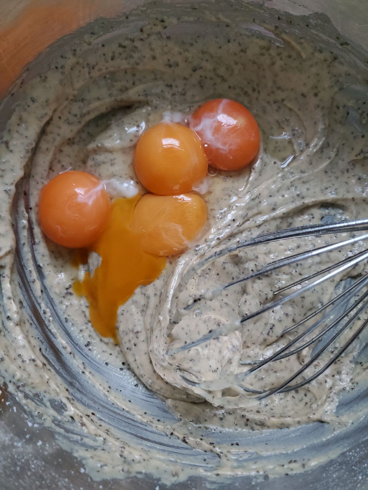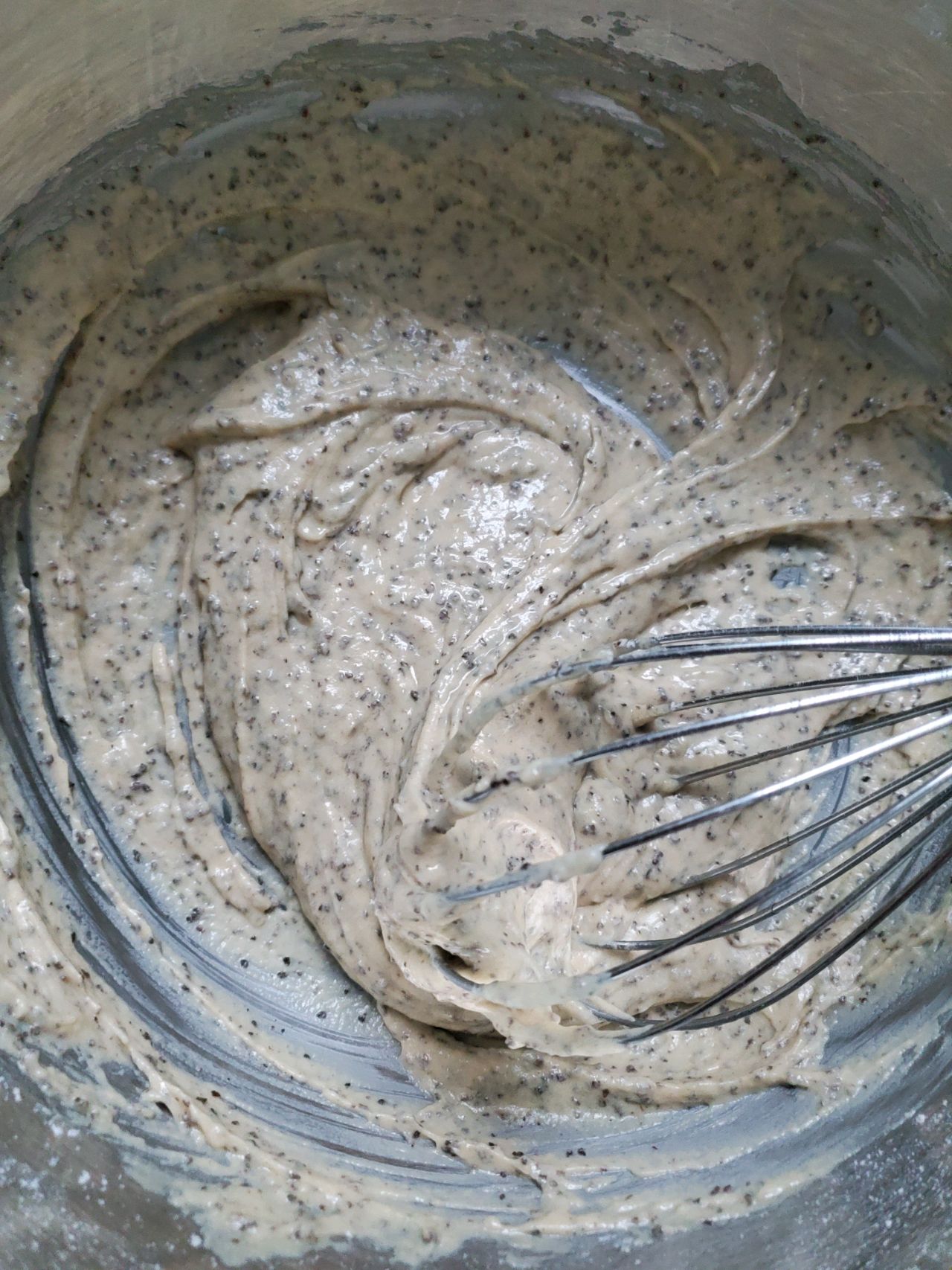 步骤7、再将全部蛋黄糊倒入蛋白中翻拌均匀