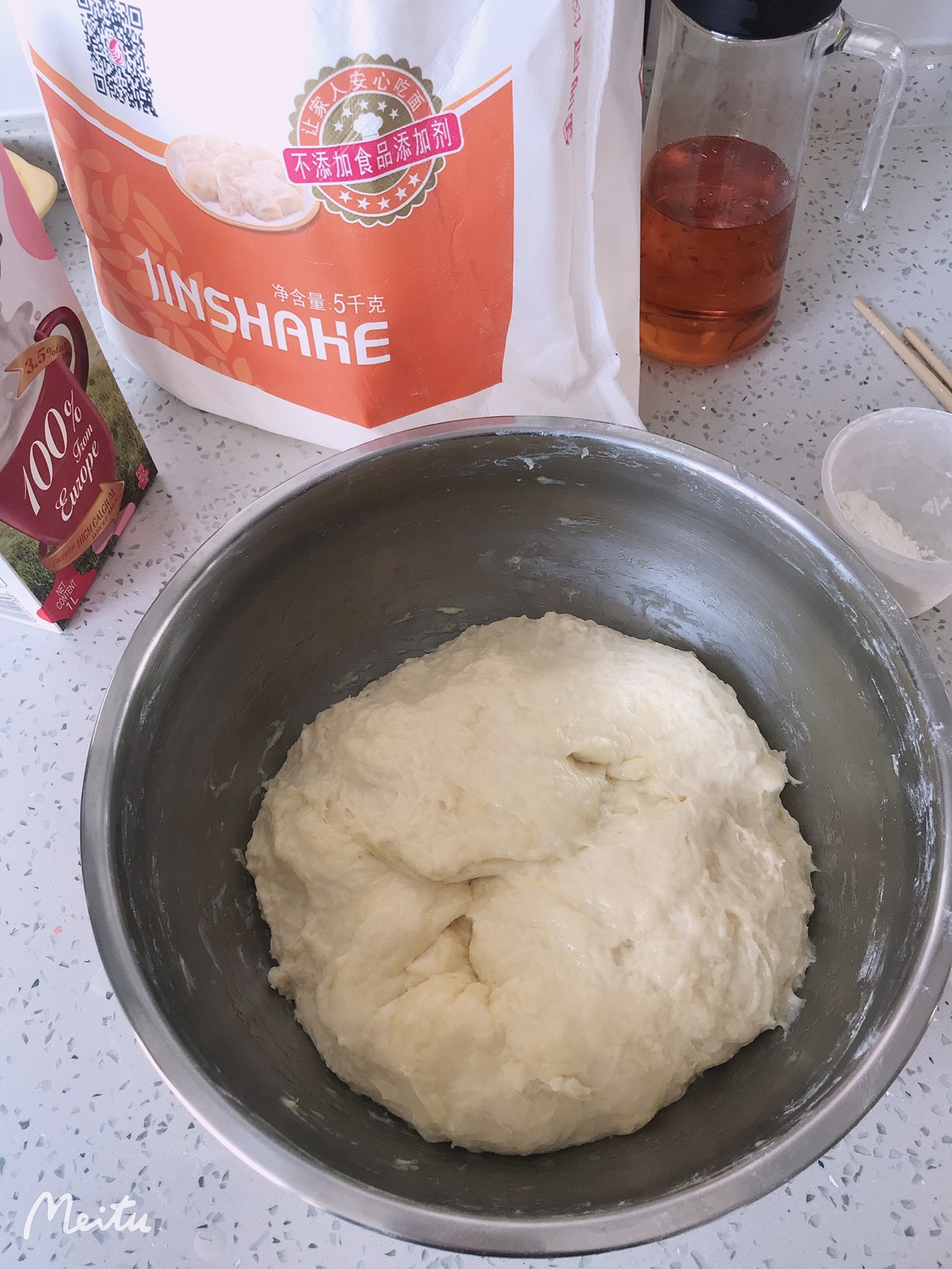 辅料:酵母粉一勺、鸡蛋三个三个、白糖一碗一碗、豆油少许少许、牛奶适量
