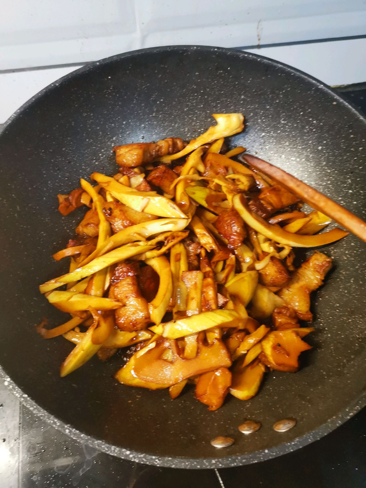 辅料:香叶3片、冰糖10粒、红烧酱油2小勺、生抽1小勺、白醋1小勺、笋300克、料酒1小勺