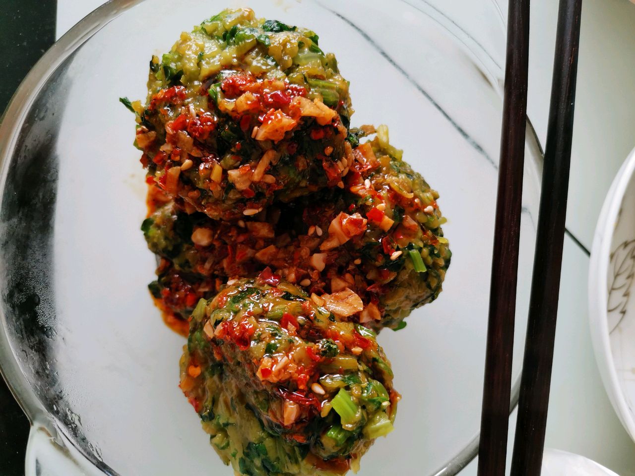 步骤5、调汁儿,蒜泥、辣椒面、盐,热油上浇。再加入醋、味极鲜、小撮白砂糖,按照个人喜好调好,浇到刚出锅的团子上,美极了