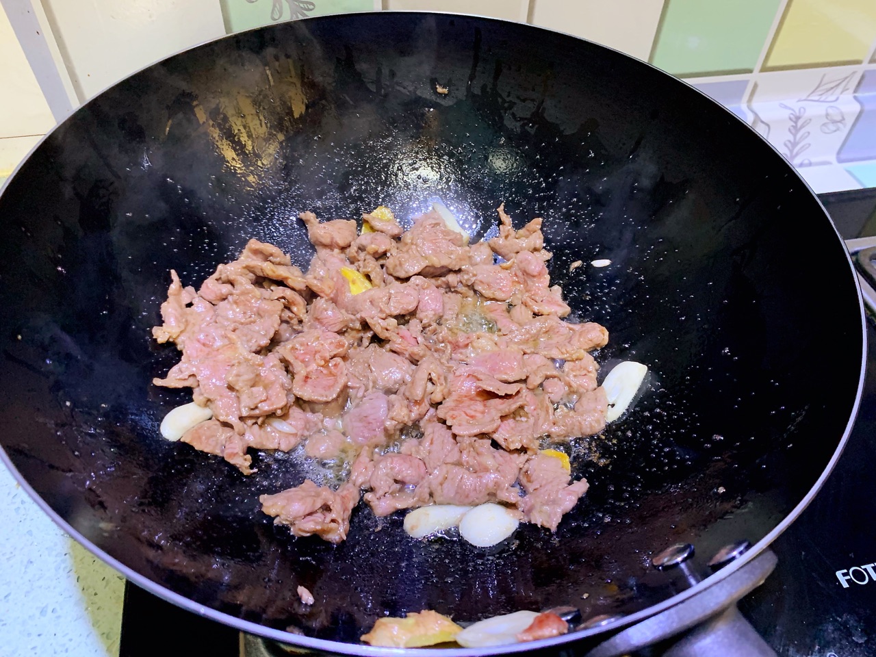 步骤5、倒入腌好牛肉快速翻炒至变色,盛出。