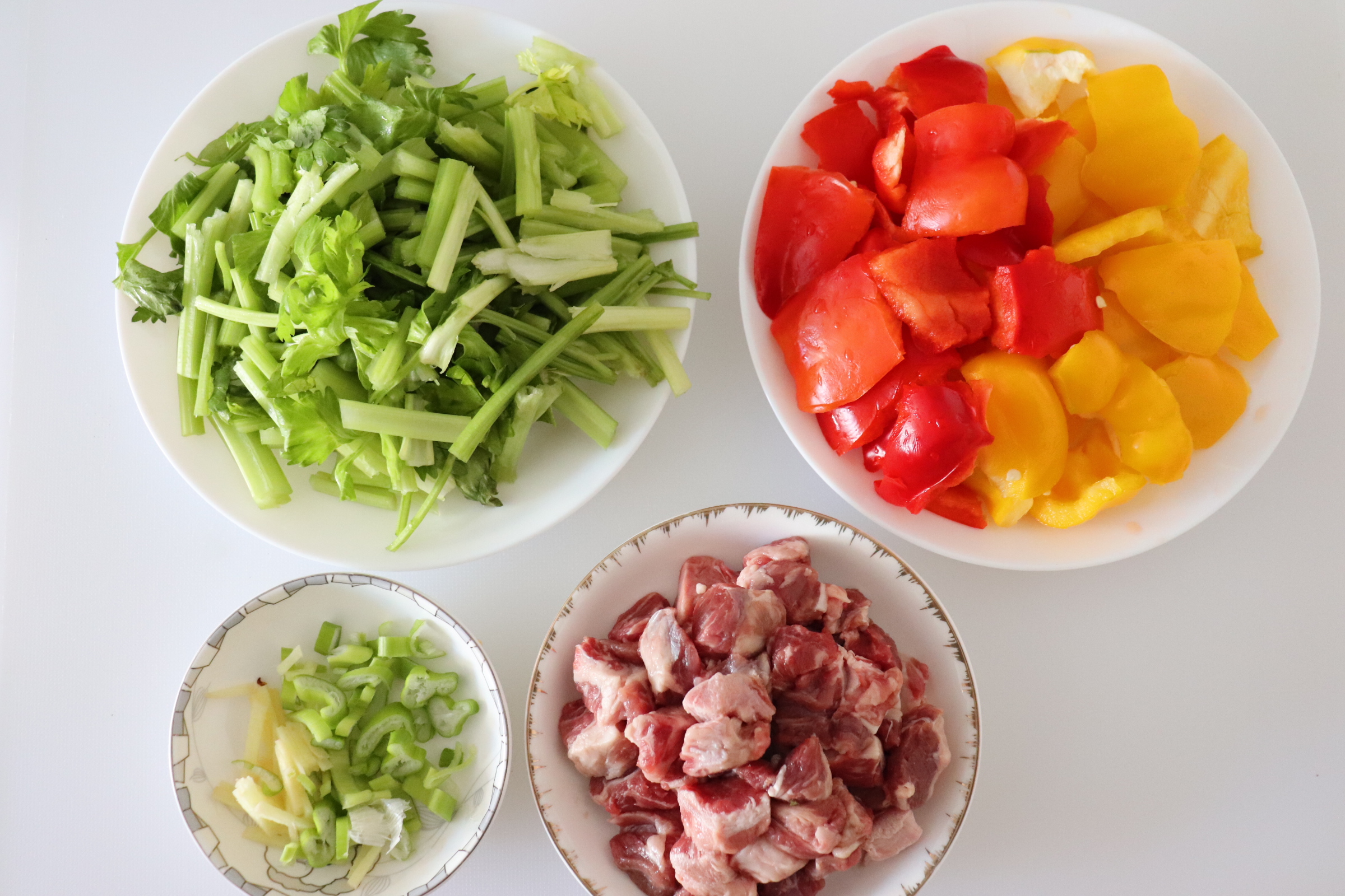 步骤2、彩椒掰成小块,芹菜切段,牛肉切粒,切葱花和姜丝
