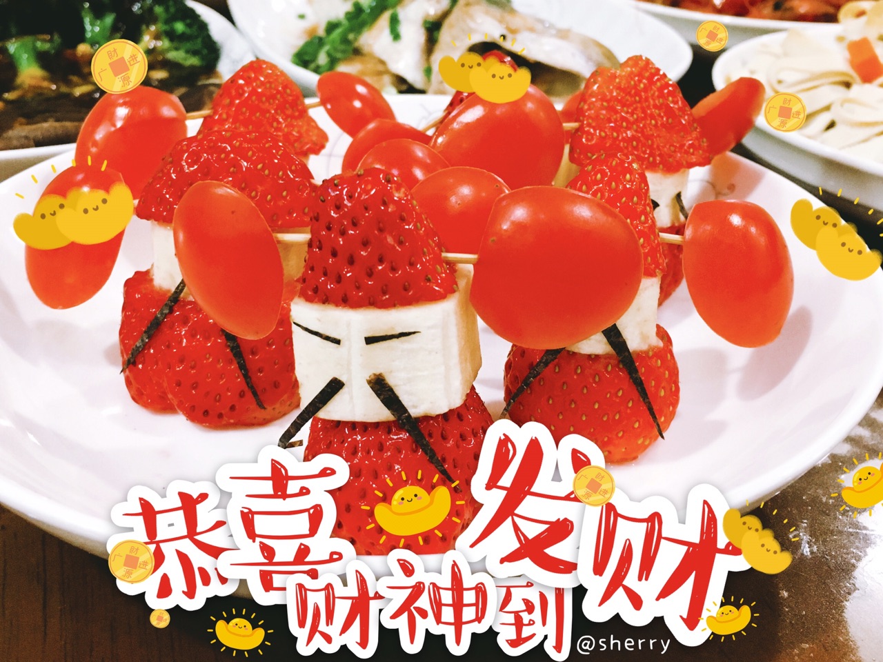 步骤3、一个小番茄切出两片,牙签中间折断成两节,把帽子做好
