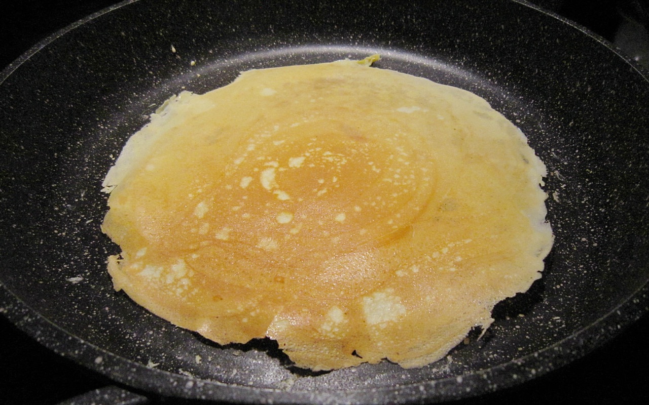步骤4、开中小火,在不粘平底锅里倒入适量蛋液,然后用面糊推子推均匀成薄饼,煎成金黄色;