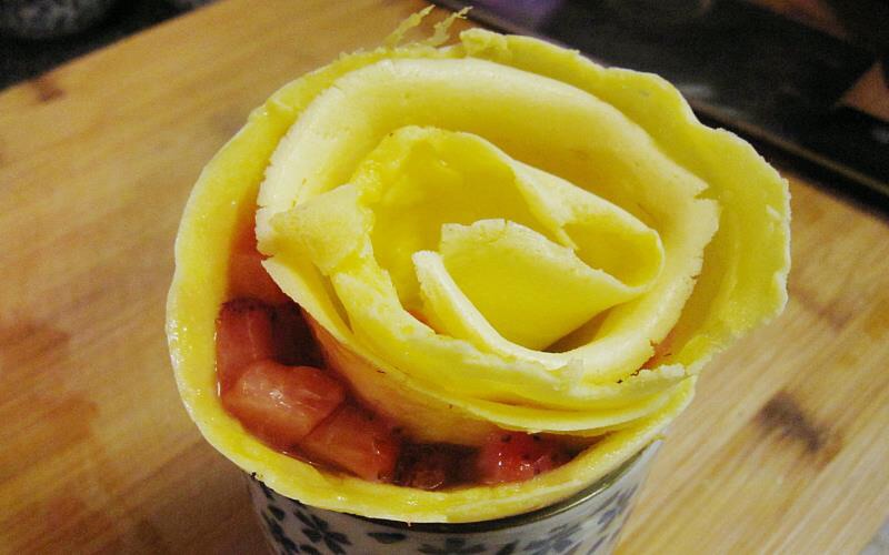 可丽饼比较容易做,又不用烤箱,一个不粘平底锅就可以了,与新鲜水果结合起来,也是很好的点心。根据上几次的经验,煎出来的饼皮比较容易破,所以在饼皮的配方里减去黄油用量,包起来就比较容易了。
