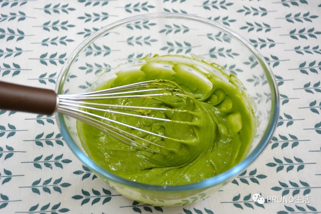 步骤2、鸡蛋打散加入抹茶液混合均匀,再将低筋面粉过筛加入,混合均匀至无颗粒。