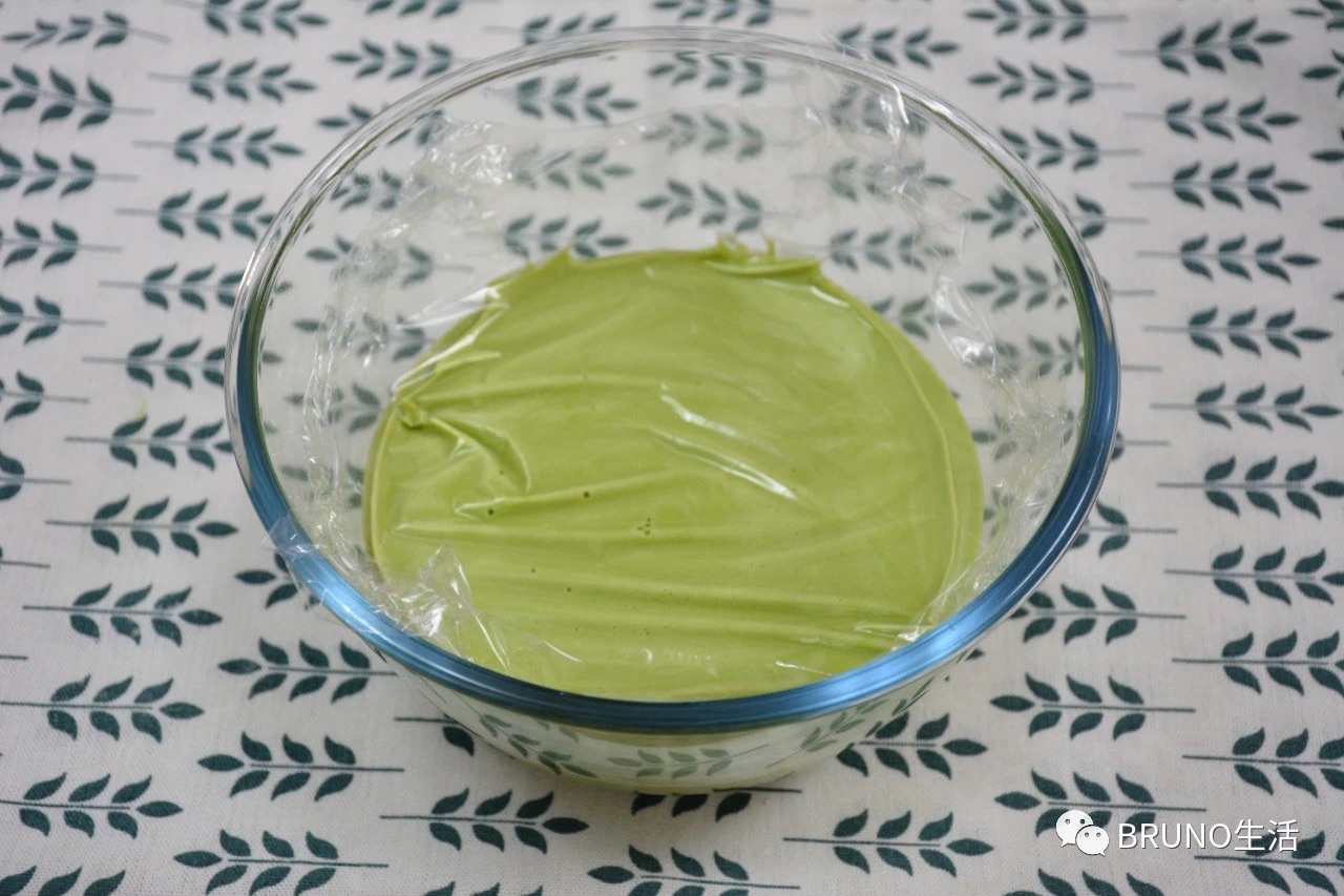 步骤5、保鲜膜铺在面糊表面,放冰箱冷藏30分钟。保鲜膜贴在面糊表面,取掉保鲜膜的时候,可以将表面难以溶解的油脂去除。