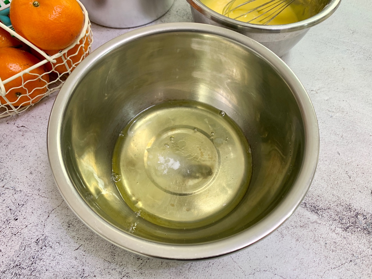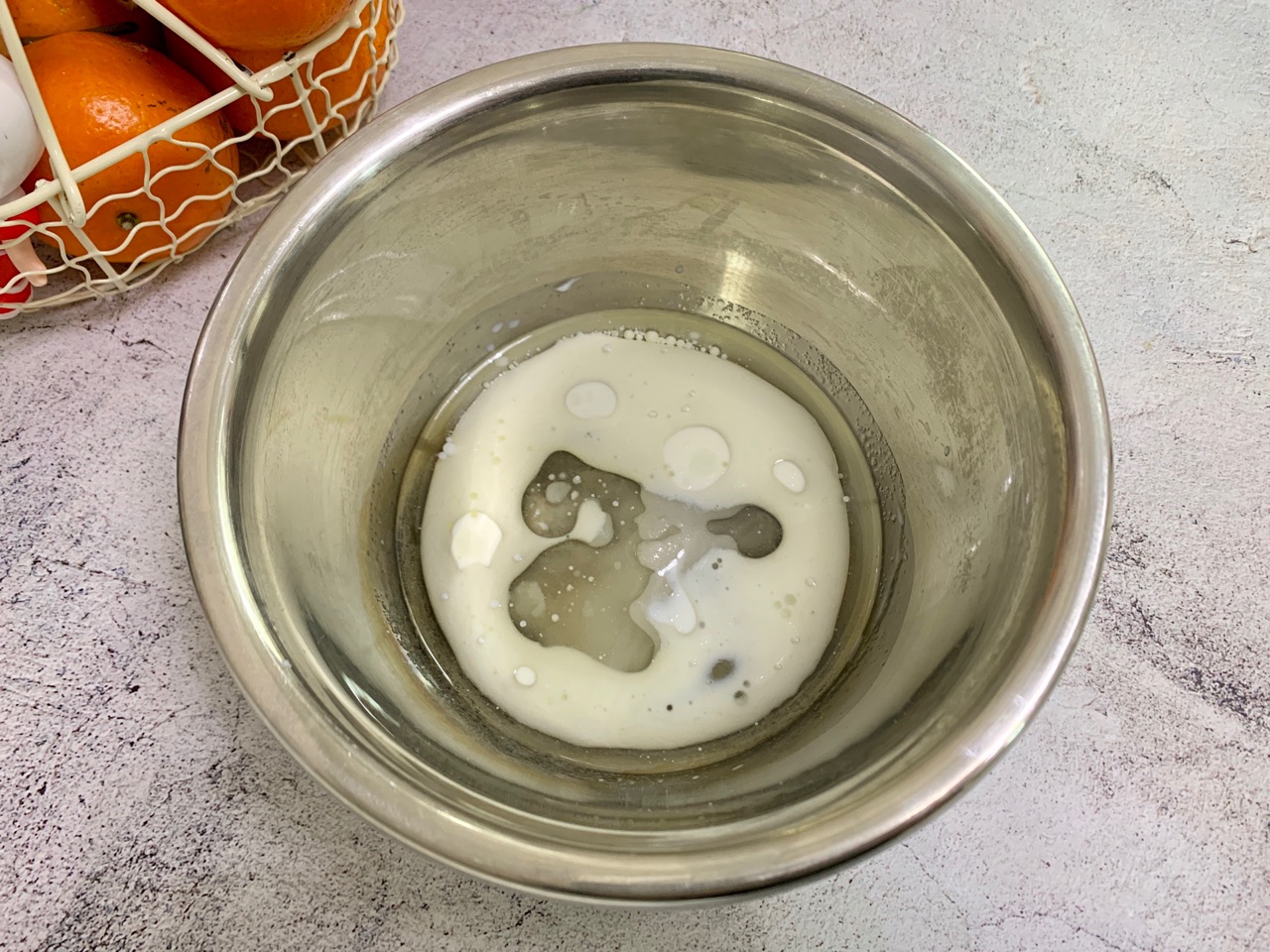 步骤1、准备两个干净无油、无水的盆,一个盆内加入油、砂糖、牛奶,用蛋抽搅拌均匀至白砂糖融化