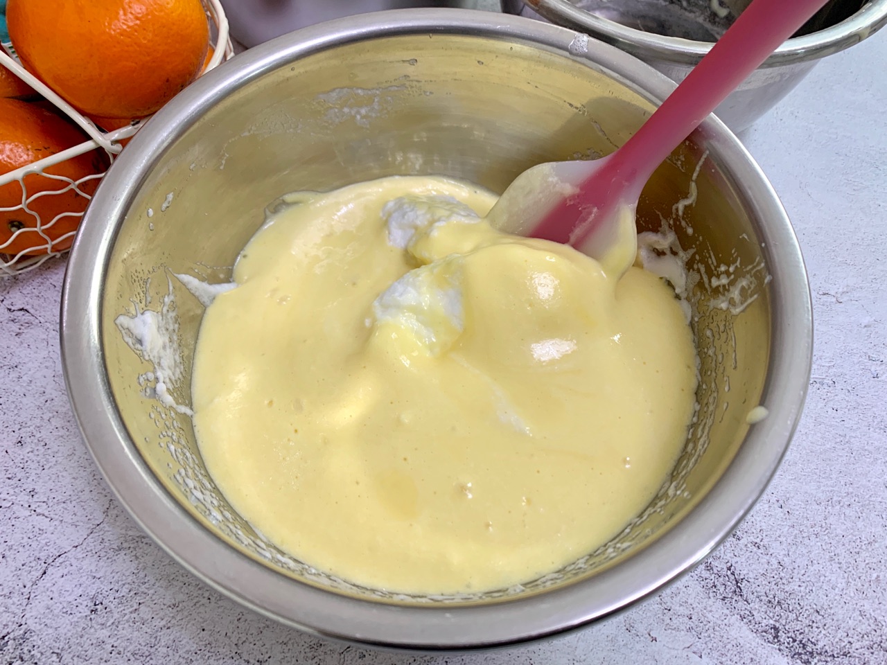 步骤9、挖三分之一蛋白糊到蛋黄糊中,用翻拌的手法混合均匀