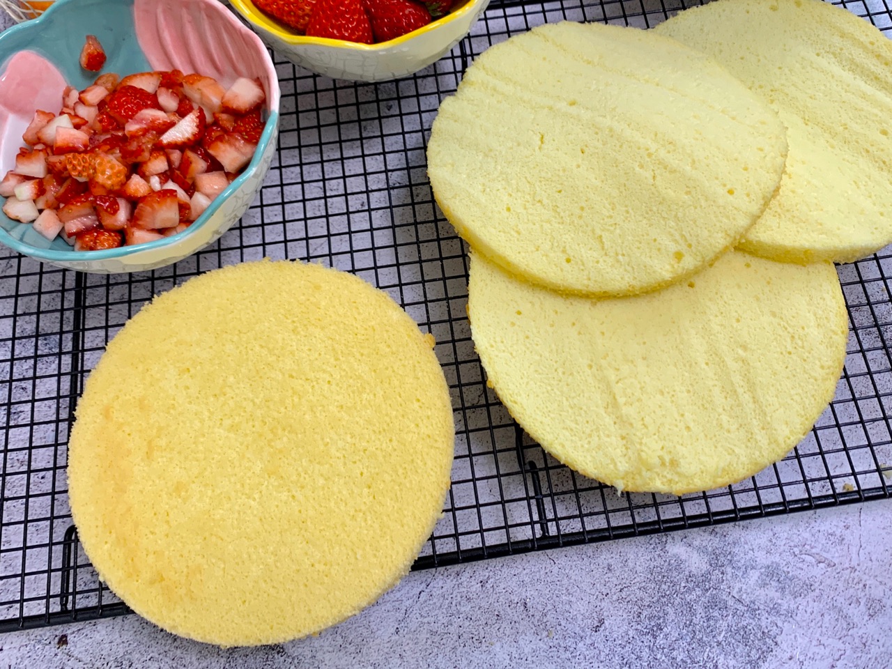 辅料:蛋黄3个、玉米油40克、细砂糖20克、牛奶45克、低筋面粉56克、玉米淀粉8克、蛋白糊、蛋清3个、柠檬汁3-4滴、细砂糖15克、抹面、夹心:、草莓适量、淡奶油250克、糖12克