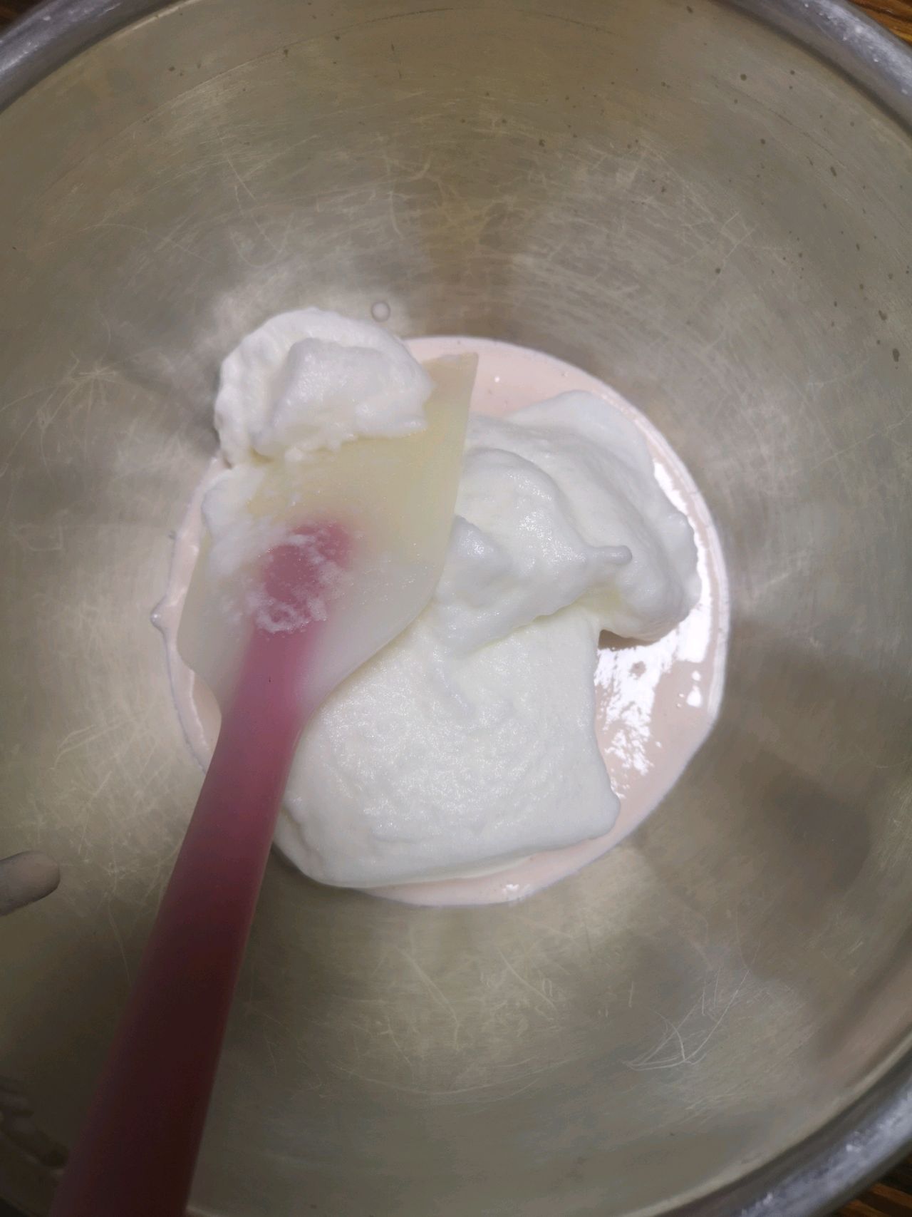 步骤9、分两次将蛋白拌入草莓奶粉糊中,从下往上拌匀。