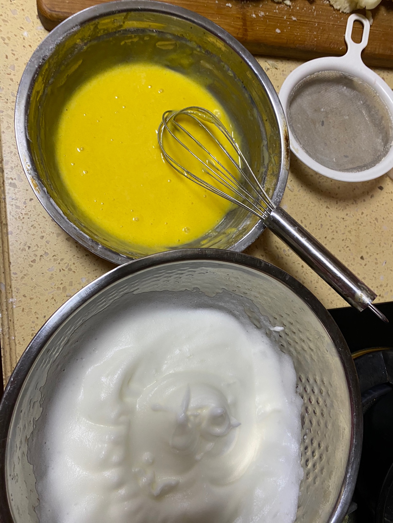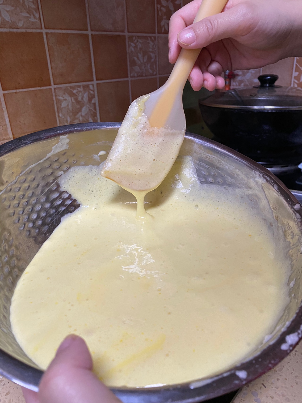 步骤14、将翻拌好的蛋黄糊倒入剩余打发好的蛋清中