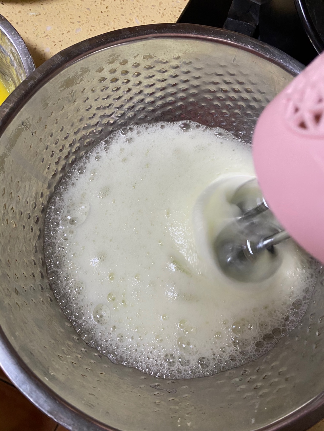 步骤8、加入少量糖,电动打蛋器打到有大泡泡状态(糖分三次加入/能把握好可一次全部加入。)