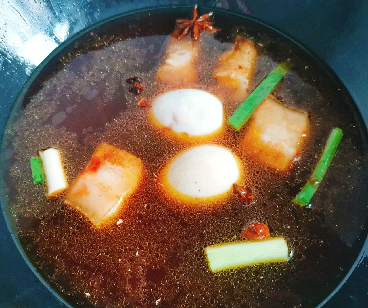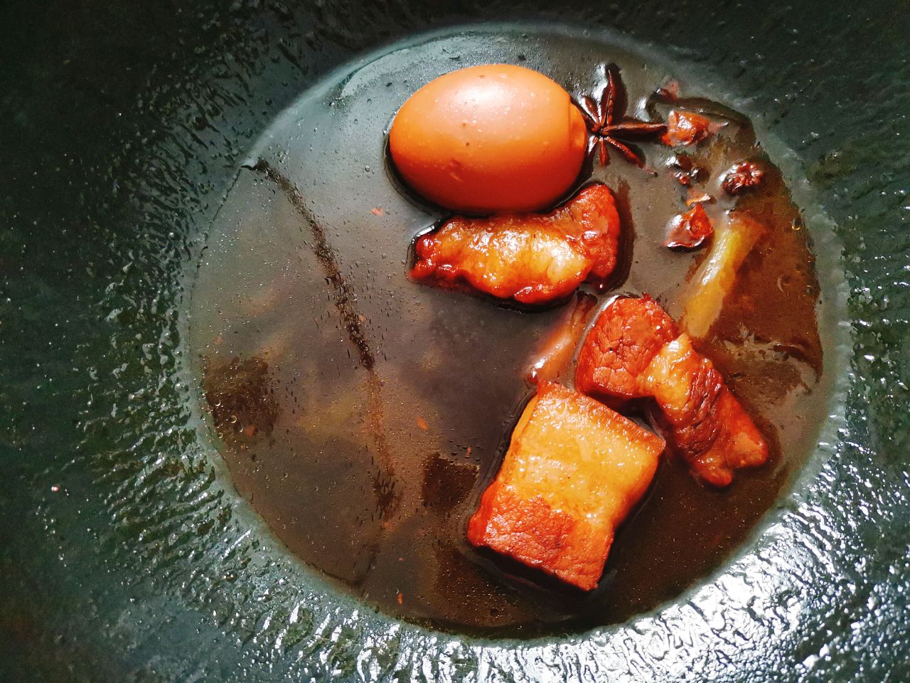 辅料:鸡蛋2个、米饭2碗、叉烧酱3勺、红糖2勺、葱1根、八角2个