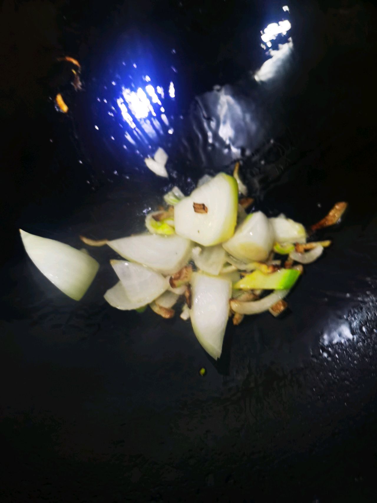 步骤1、晚餐孩子嚷嚷着要吃绿菜,长高高。家里只有这些了,凑在一起做了个素炒三样。备料:北瓜切片,葱头切块,葱末。