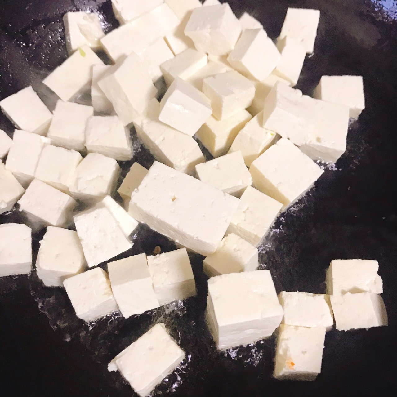 步骤4、开至大火,豆腐入锅,然后将豆腐挨个贴在锅面上,让豆腐每一面与油充分接触,每面煎至1-2分钟,不停翻面ps:喜欢吃脆感或金黄口味的朋友也可多煎一下